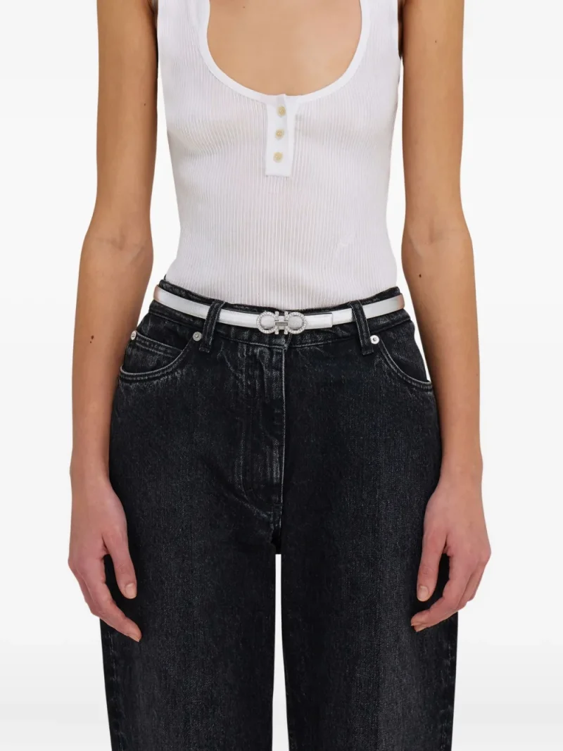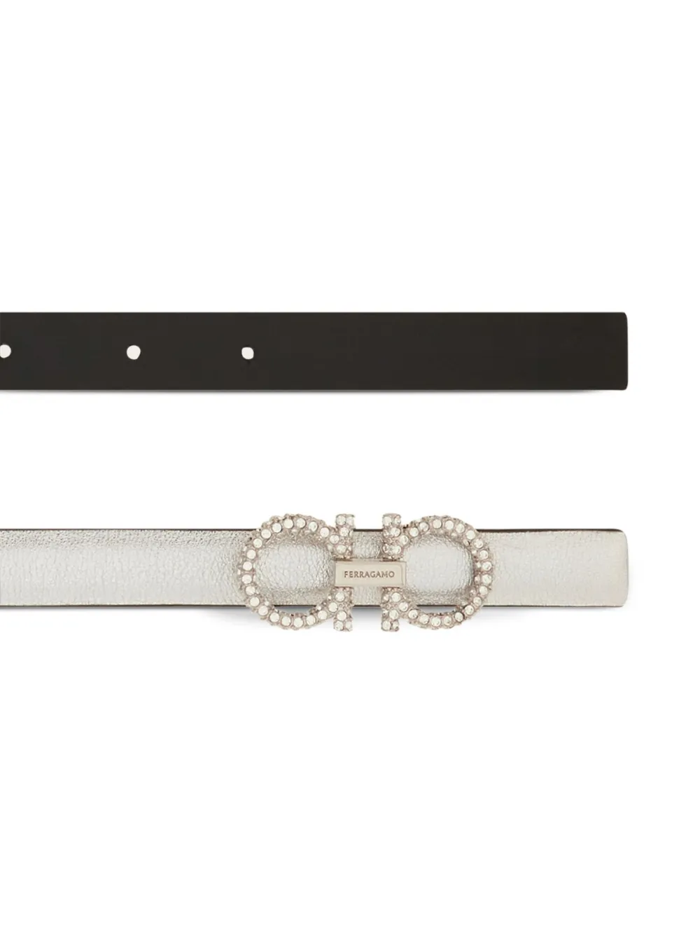 Curea Ferragamo Reversible Adjustable Gancini, din piele, model reversibil argintiu-negru, cu inchidere ajustabila si catarama Gancini cu cristale sclipitoare. 100% piele de vitel.