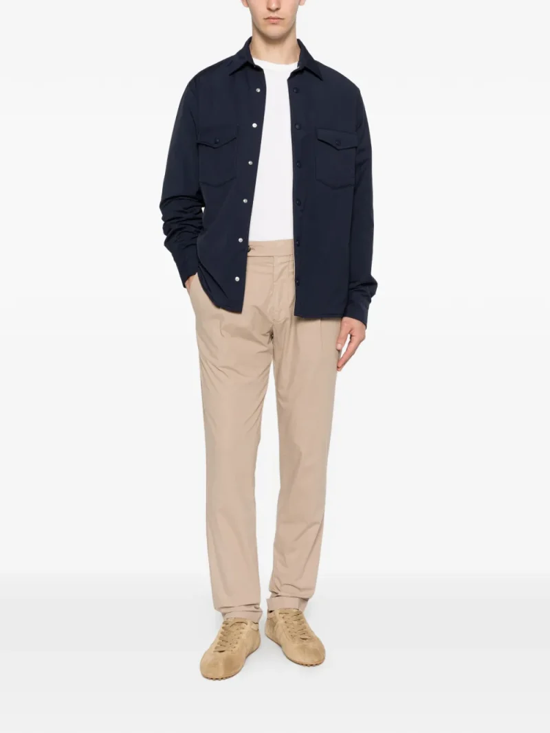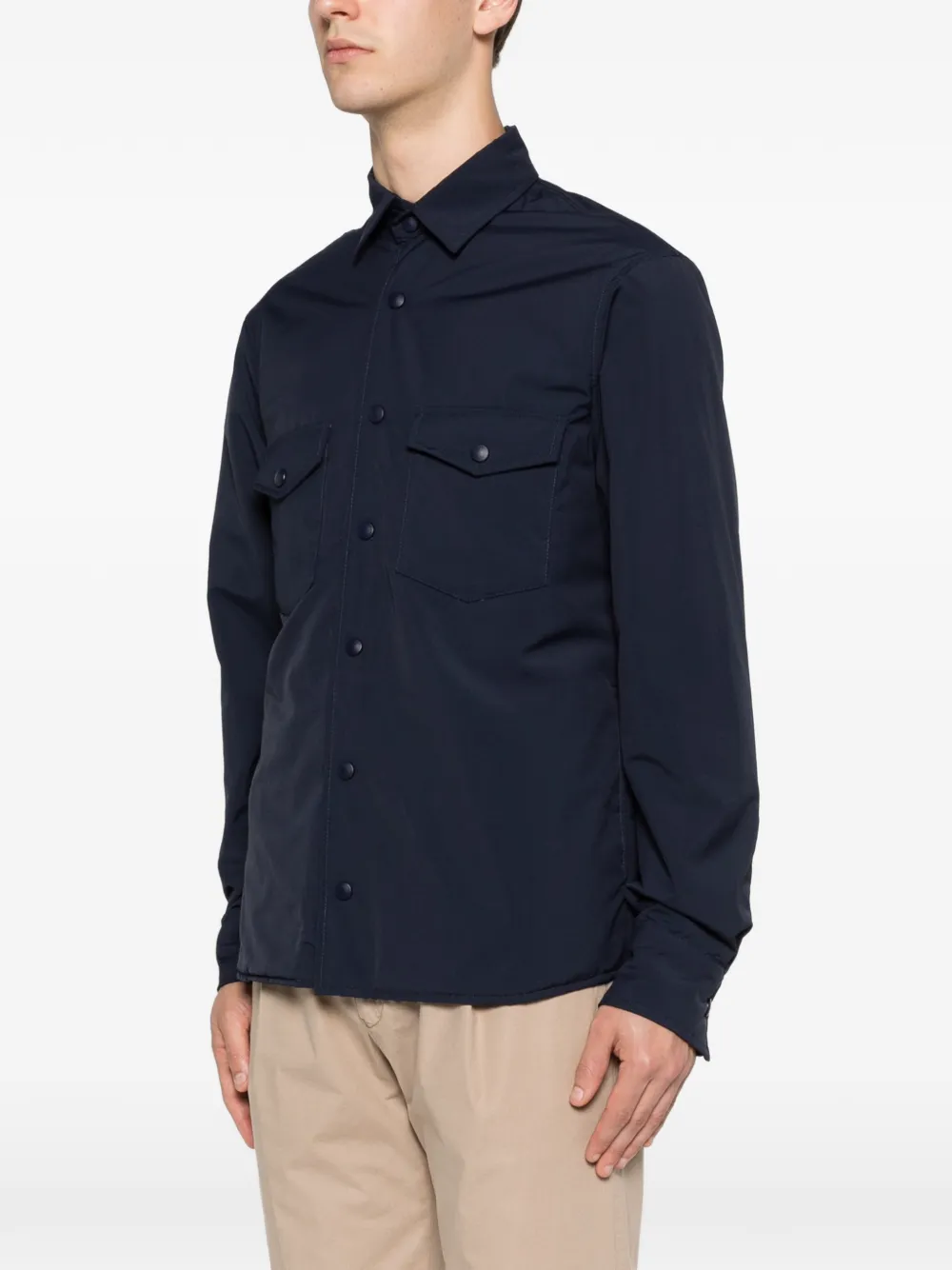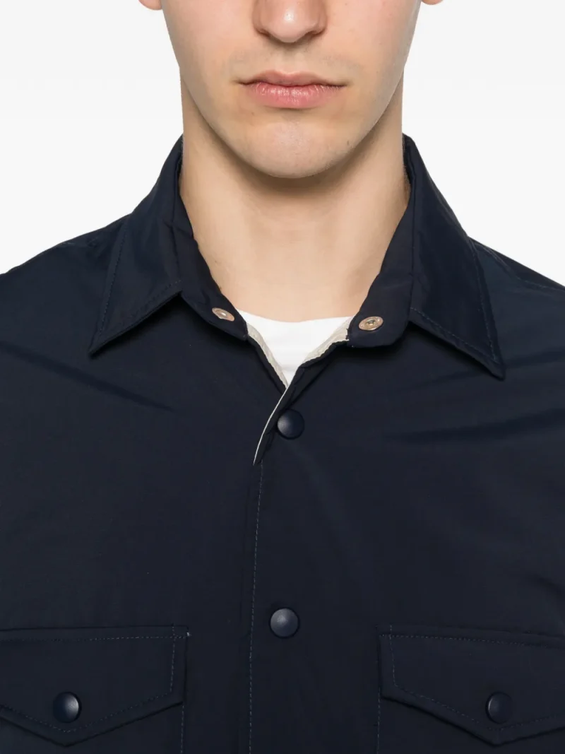 Camasa Eleventy bleumarin, design overshirt realizat din lana, cu guler clasic, inchidere cu capse, maneci lungi, buzunare aplicate la piept si tiv drept. Potrivita pentru sezonul primavara/vara. 64% lana; 36% poliamida.