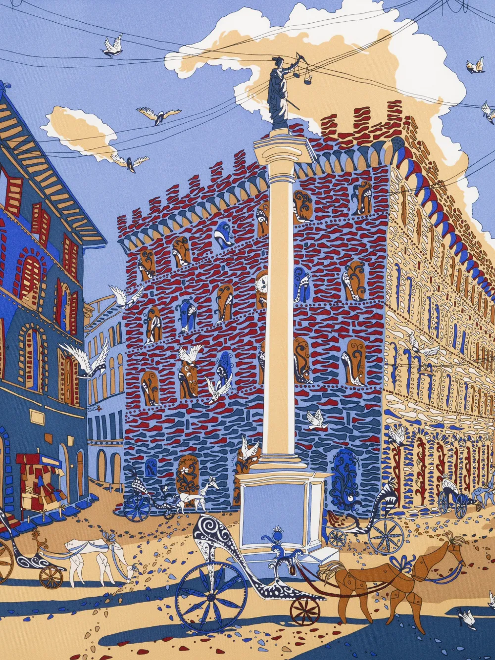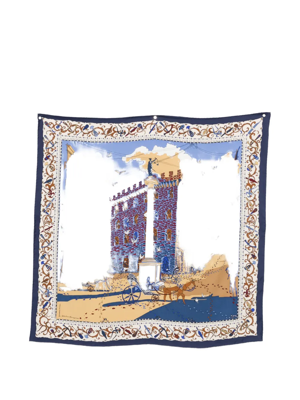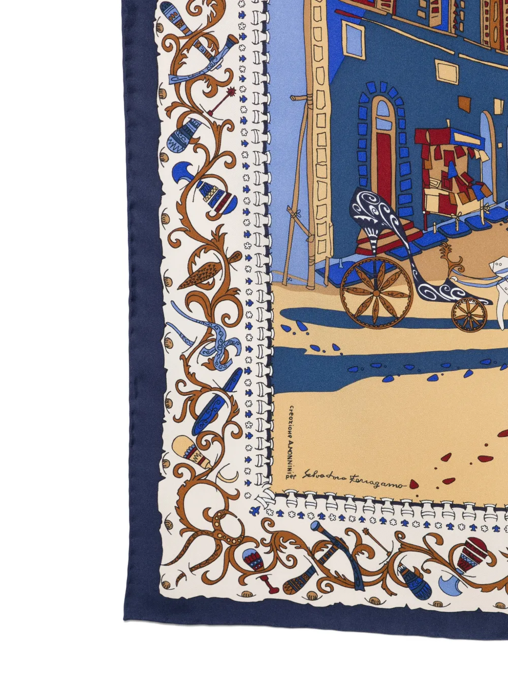 Esarfa Ferragamo Scenic Print bleumarin, realizata din matase, cu forma patrata, grafica Art Noveau contemporana si logo imprimat. 100% matase.