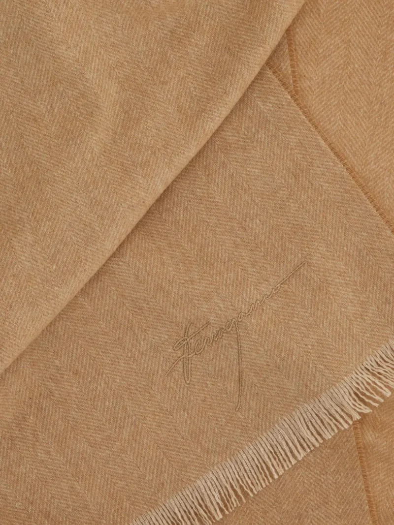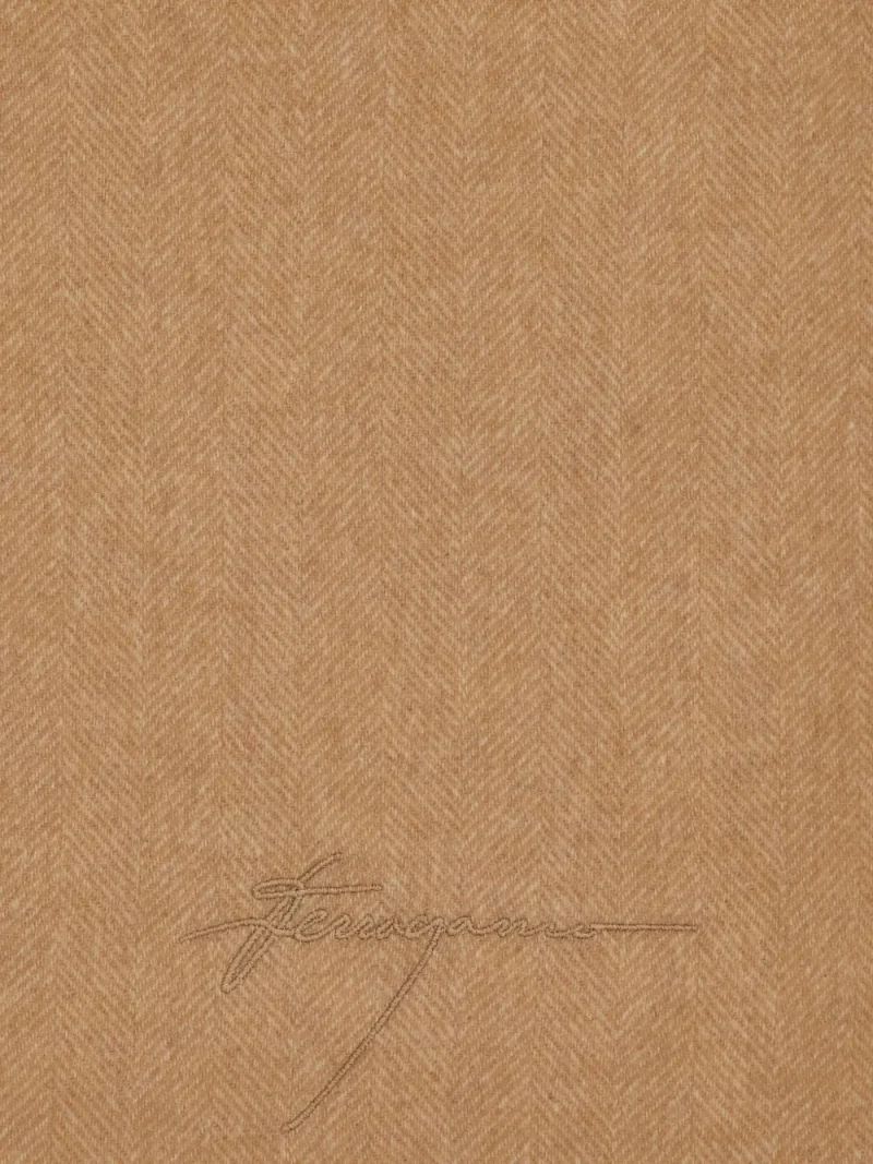 Fular Ferragamo Chevron-Pattern Fringed bej, din casmir, cu forma dreptunghiulara, tesatura Herringbone si logo brodat. Detalii: Lungime- 230 cm; Latime- 35 cm. 95% casmir; 5% lana.