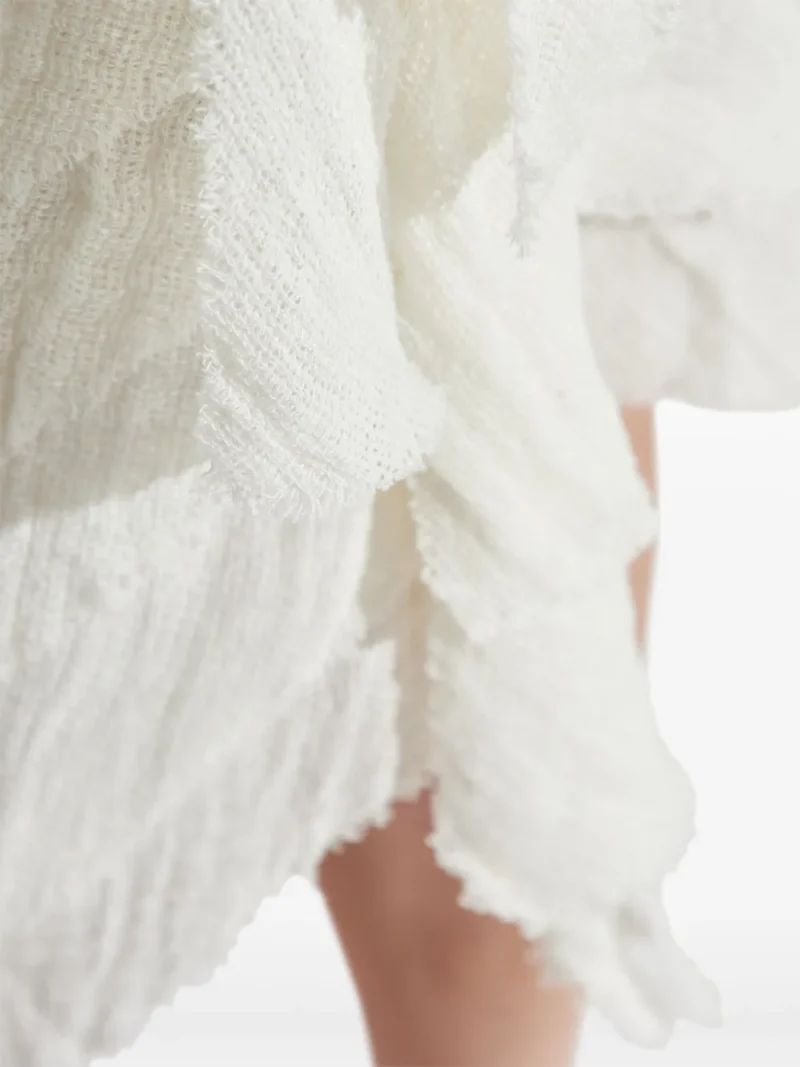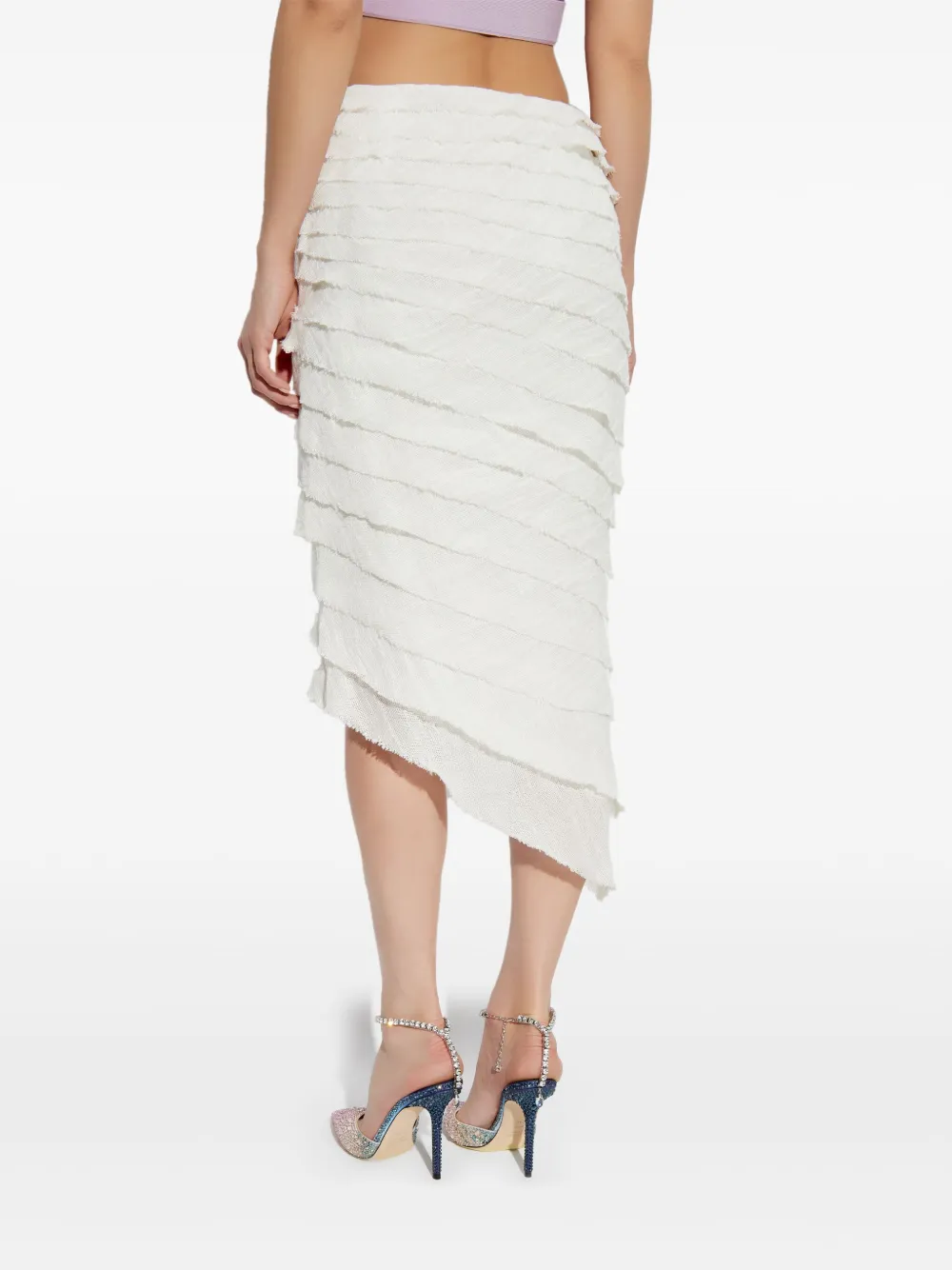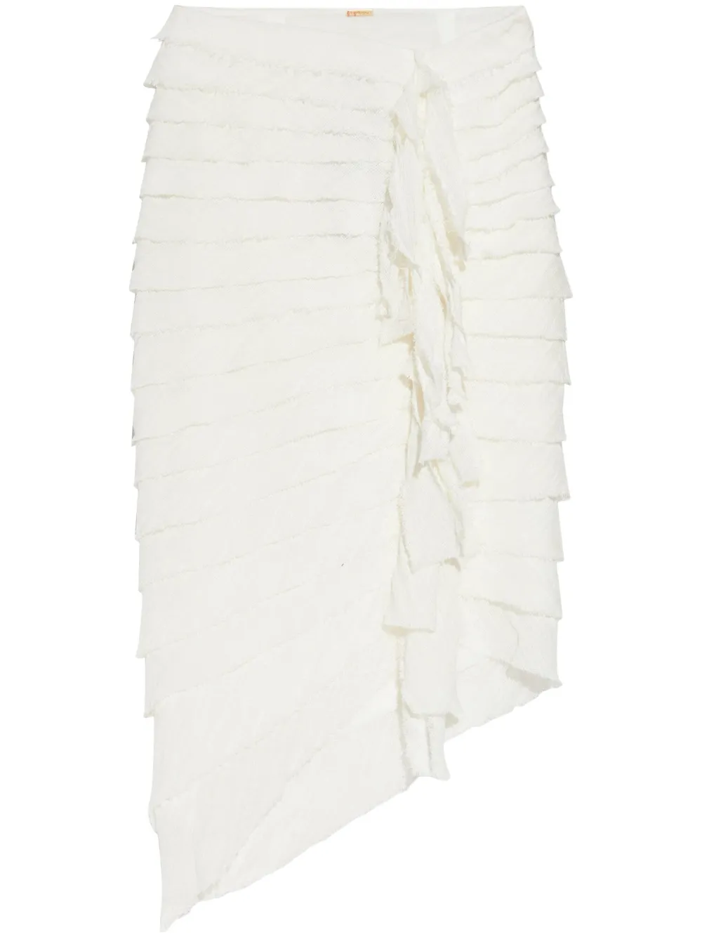 Fusta midi New Season Cult Gaia Leo ecru, din in, cu talie medie, decorata integral cu volane si tiv asimetric. Potrivita pentru sezonul primavara/vara. 95% in; 5% nailon; 72% nailon; 25% elastan.