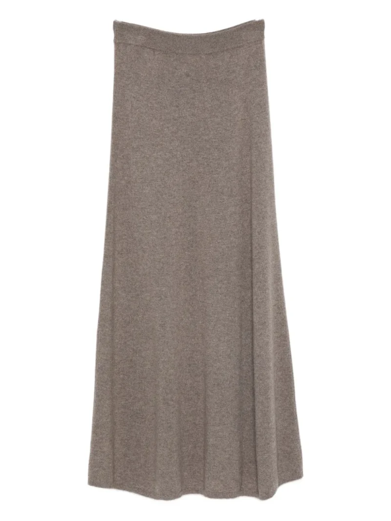 Fusta Lisa Yang Ribbed-Trim Cashmere maro, tricotata din casmir, cu talie elastica, croiala evazata si tesatura ribata. Potrivita pentru sezonul toamna/iarna. 100% casmir.