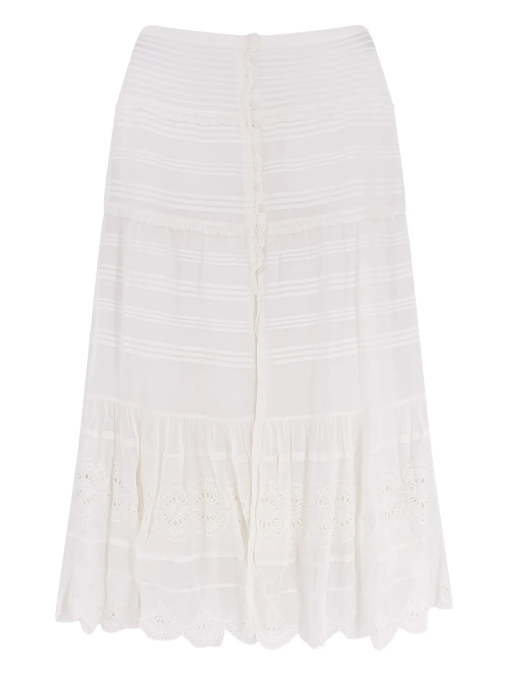 Fusta Marant Etoile Paoline embroidered alba, cu broderie decorativa, design in straturi, inchidere frontala cu nasturi, talie elastica tip smock si tiv ondulat. 100% bumbac