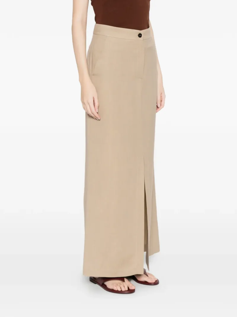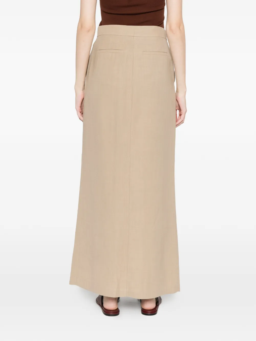 Fusta maxi Antonelli Jamie Button Slit bej, realizata din mix de viscoza si in, cu talie inalta, inchidere cu nasture si fermoar, buzunare laterale, buzunare welt la spate, slit inalt si tiv drept. Potrivita pentru sezonul primavara/vara. 73% viscoza; 27% in.