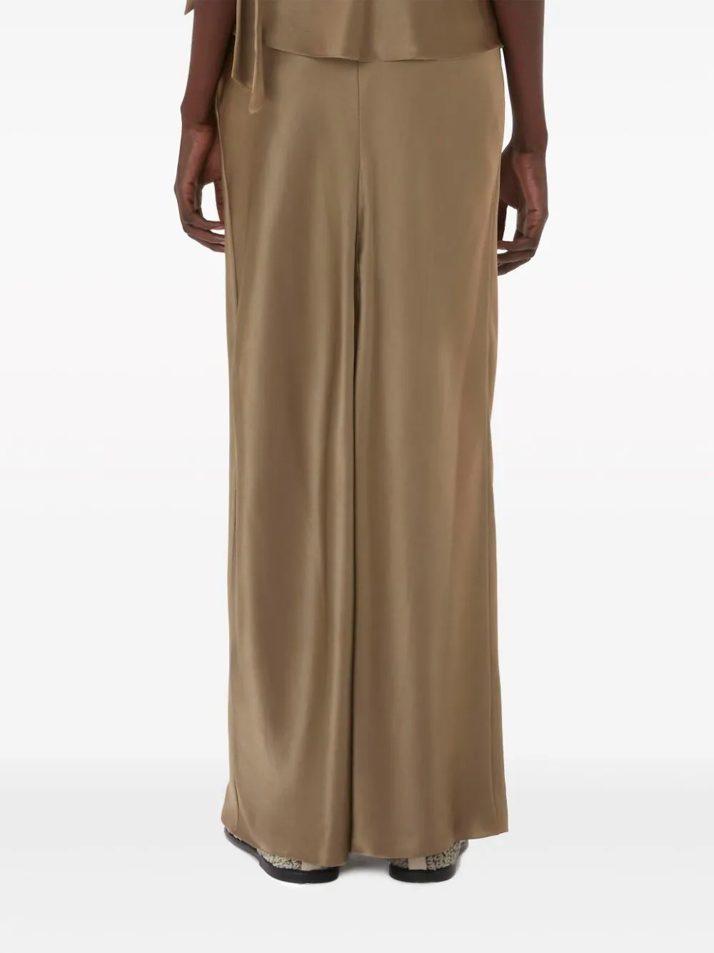 Fusta maxi khaki din matase satinata, cu talie inalta, inchidere fermoar ascuns pe laterala, design drapat si tiv curbat. Potrivita pentru sezonul primavara/vara. 100% matase.
