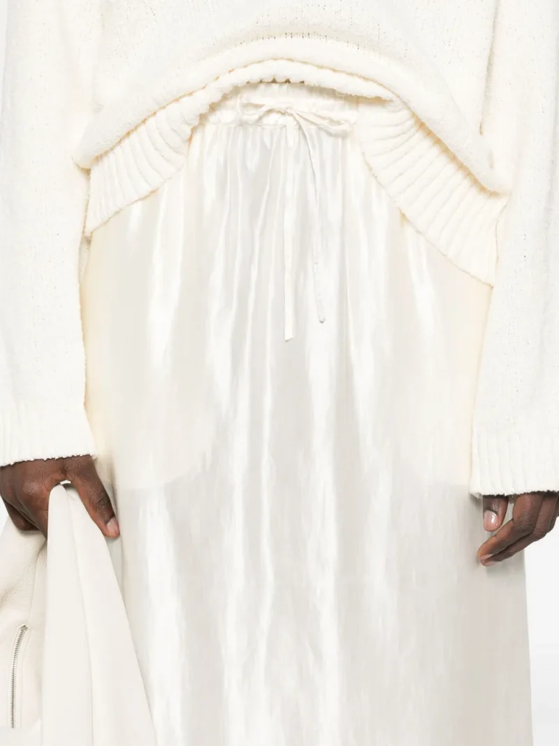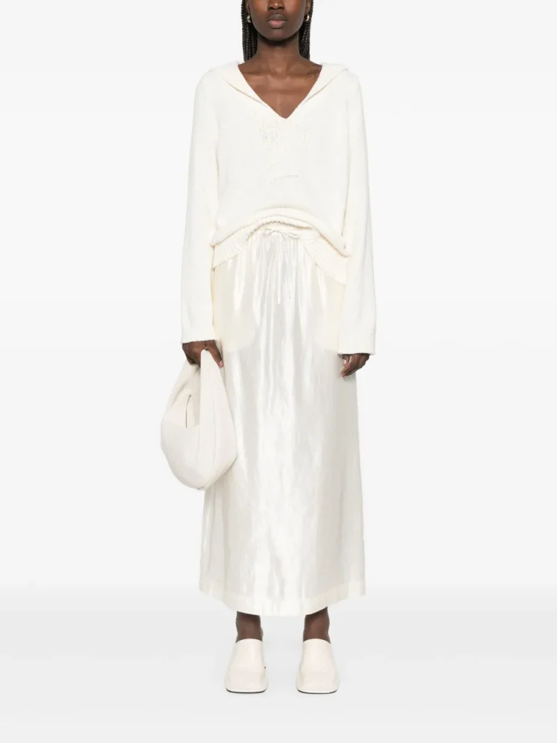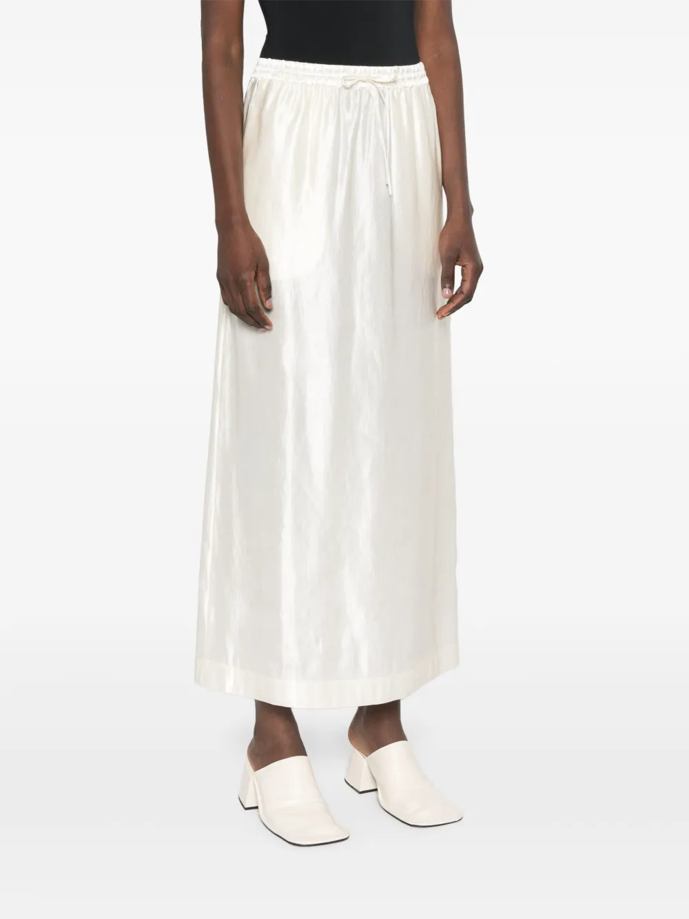 Fusta maxi Loulou de Saison Satin alb, din in si matase satinate, cu talie elastica si inchidere snur, buzunare laterale, pliu la spate si tiv drept. Potrivita pt sezonul primavara/vara. 70% in; 30% matase.