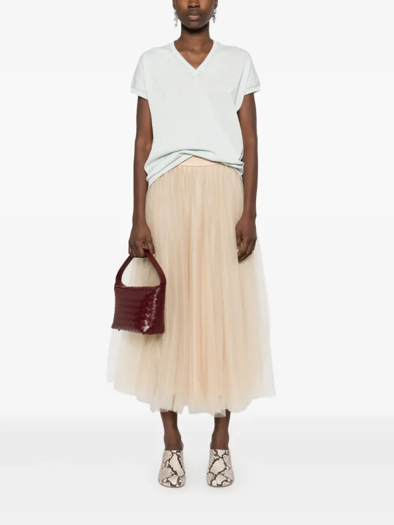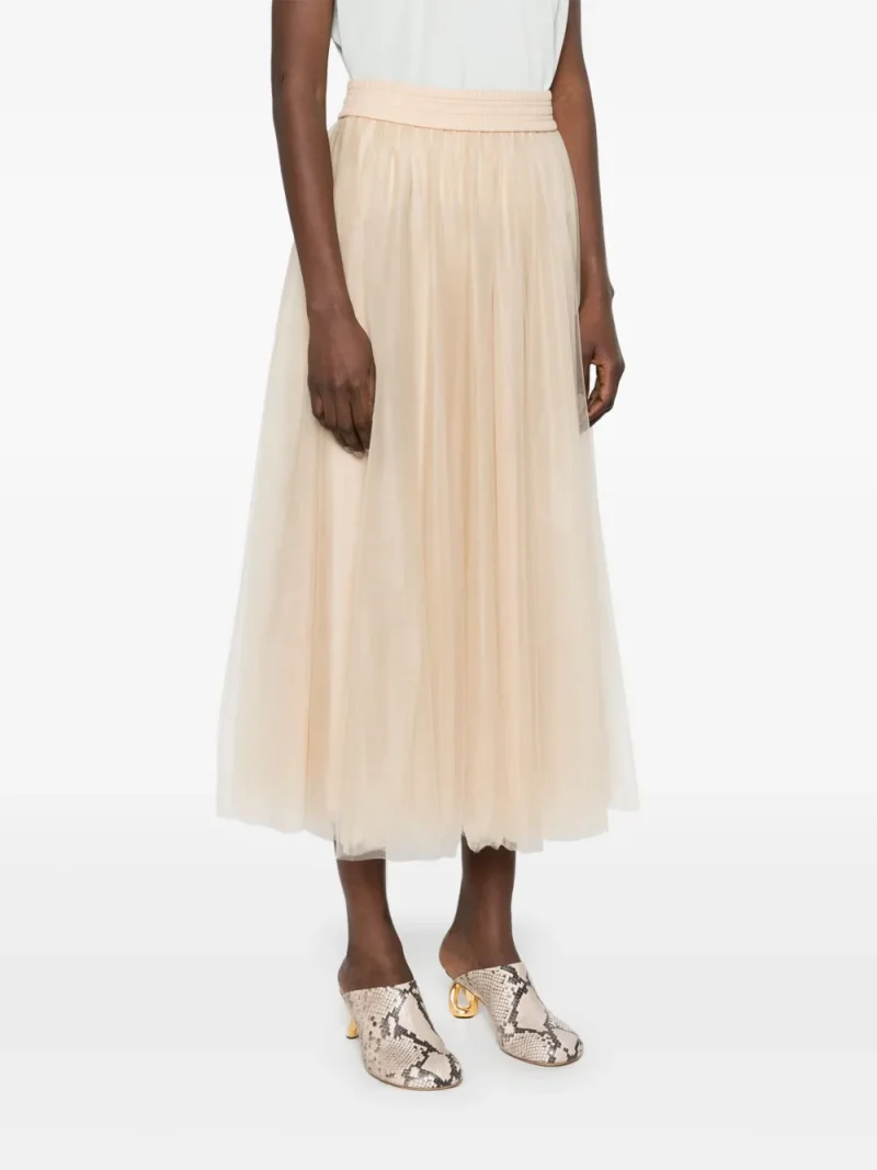Fusta midi Fabiana Filippi Tulle bej, din nailon, cu talie elastica, inchidere ascunsa cu fermoar pe lateral, captuseala din poliamida si tiv drept. Potrivita pentru sezonul primavara/vara. 82% poliester; 18% elastan; 100% poliamida.