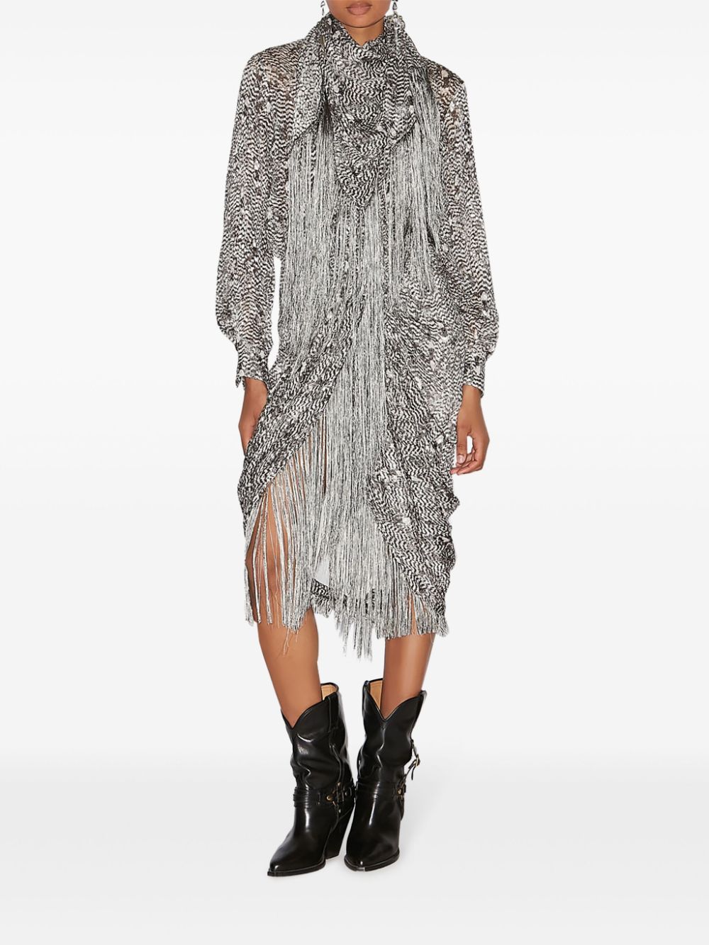 Fusta midi Isabel Marant Roany negru, din mix de materiale, design drapat, cu talie medie, detalii cu franjuri, grafica „Roany” imprimata, captusela din matase si tiv frajurat. Potrivita pentru sezonul primavara/vara. 50% matase; 50% viscoza; 100% matase.
