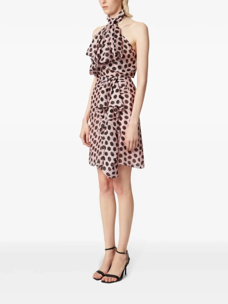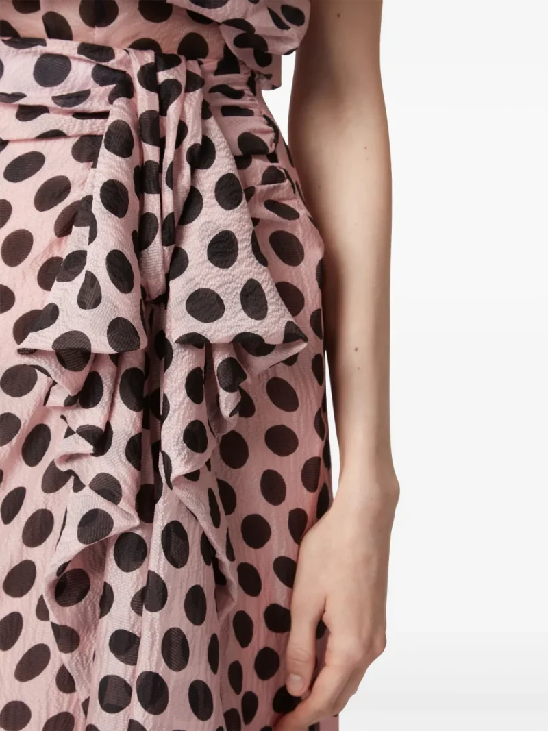 Fusta midi Nina Ricci Asymmetric Bow roz, din matase, cu talie inalta, inchidere cu fermoar ascuns pe lateral, volan decorativ, grafica Polka Dot, dungi in tesatura, captuseala din cupro si tiv drept. Potrivita pentru sezonul primavara/vara. 100% cupro; 100% matase.