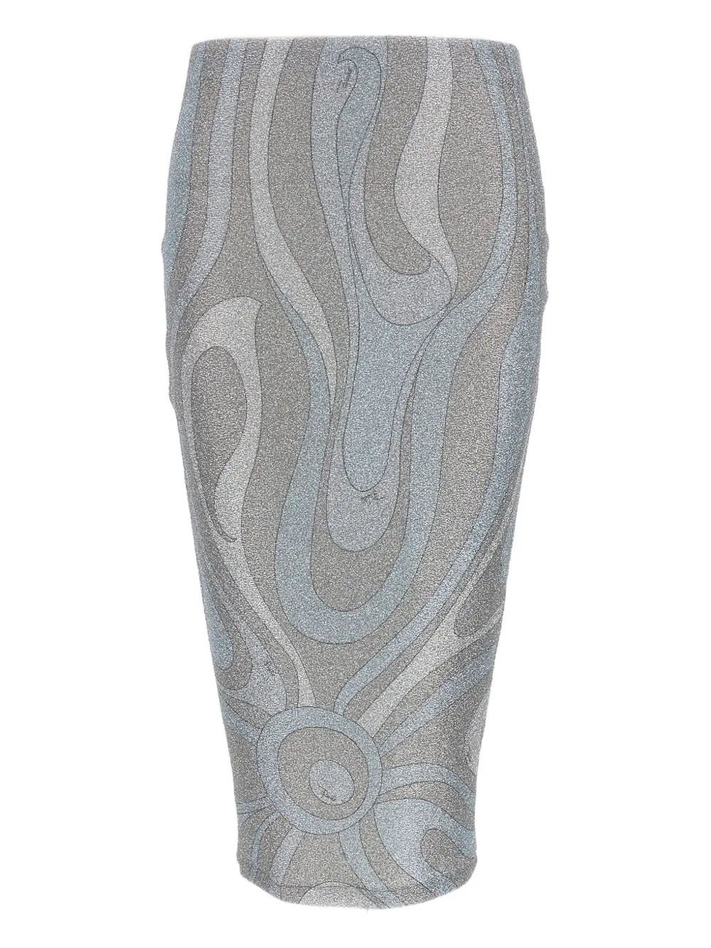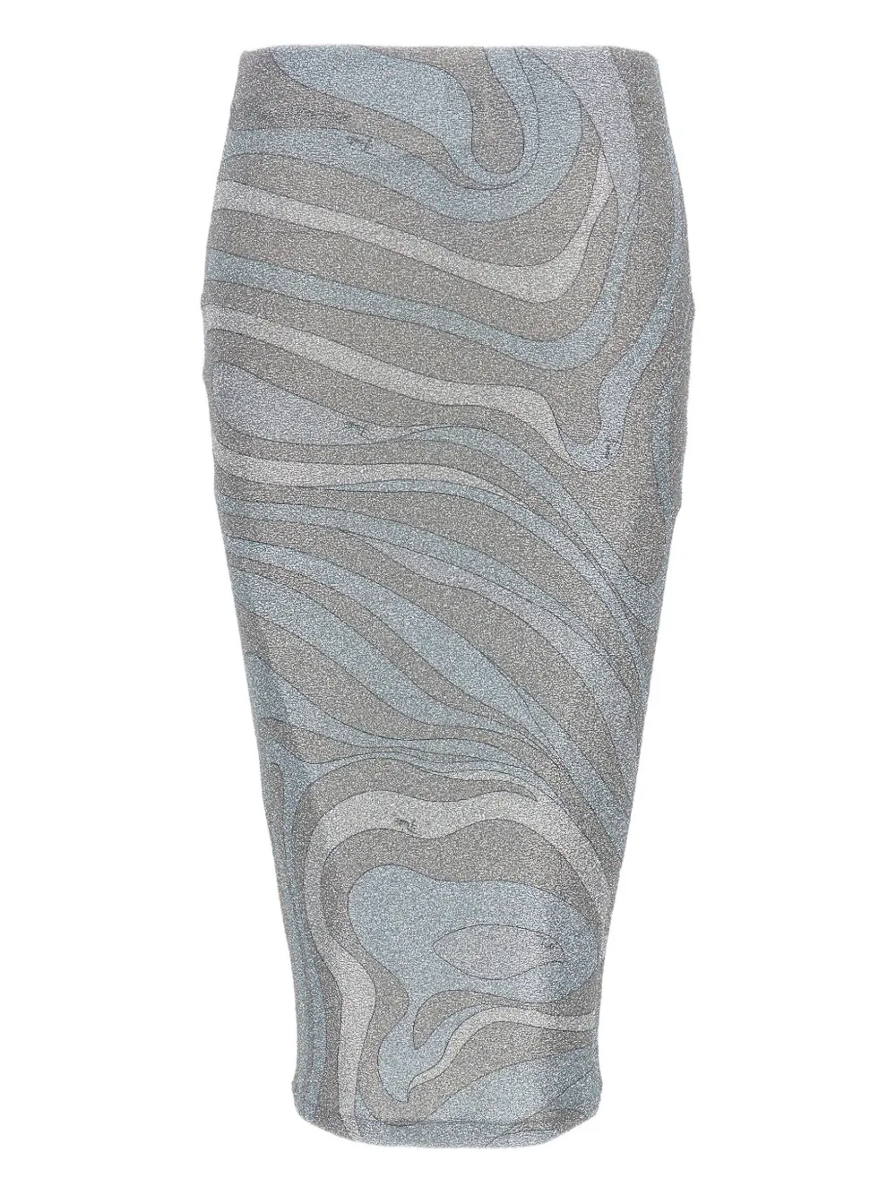 Fusta midi PUCCI Iride Metallic argintiu, cu talie inalta, croiala tip creion, tesatura cu fibre metalice integrate, cusaturi contrastante si tiv drept. Potrivita pentru sezonul toamna/iarna. 100% textil.