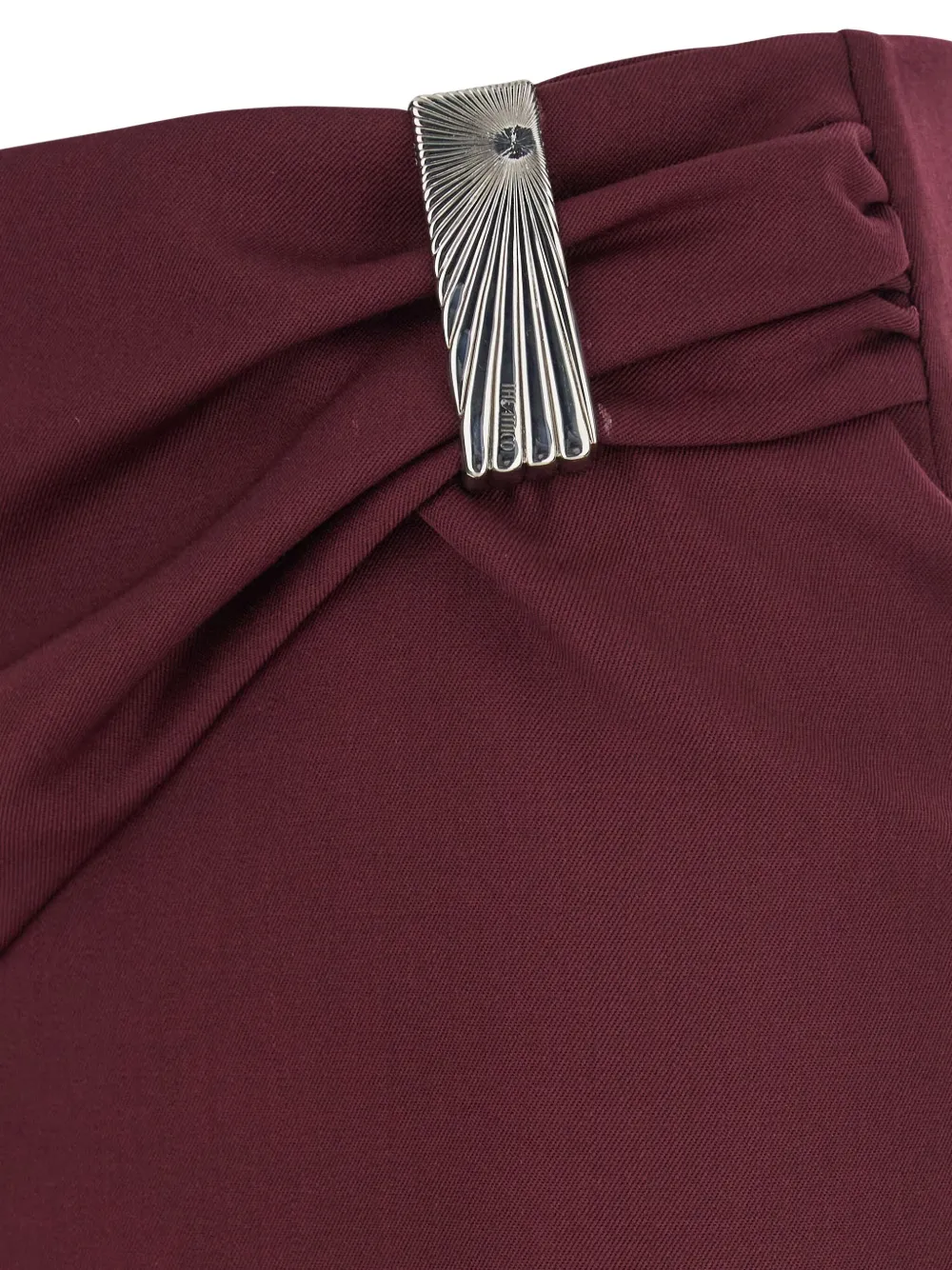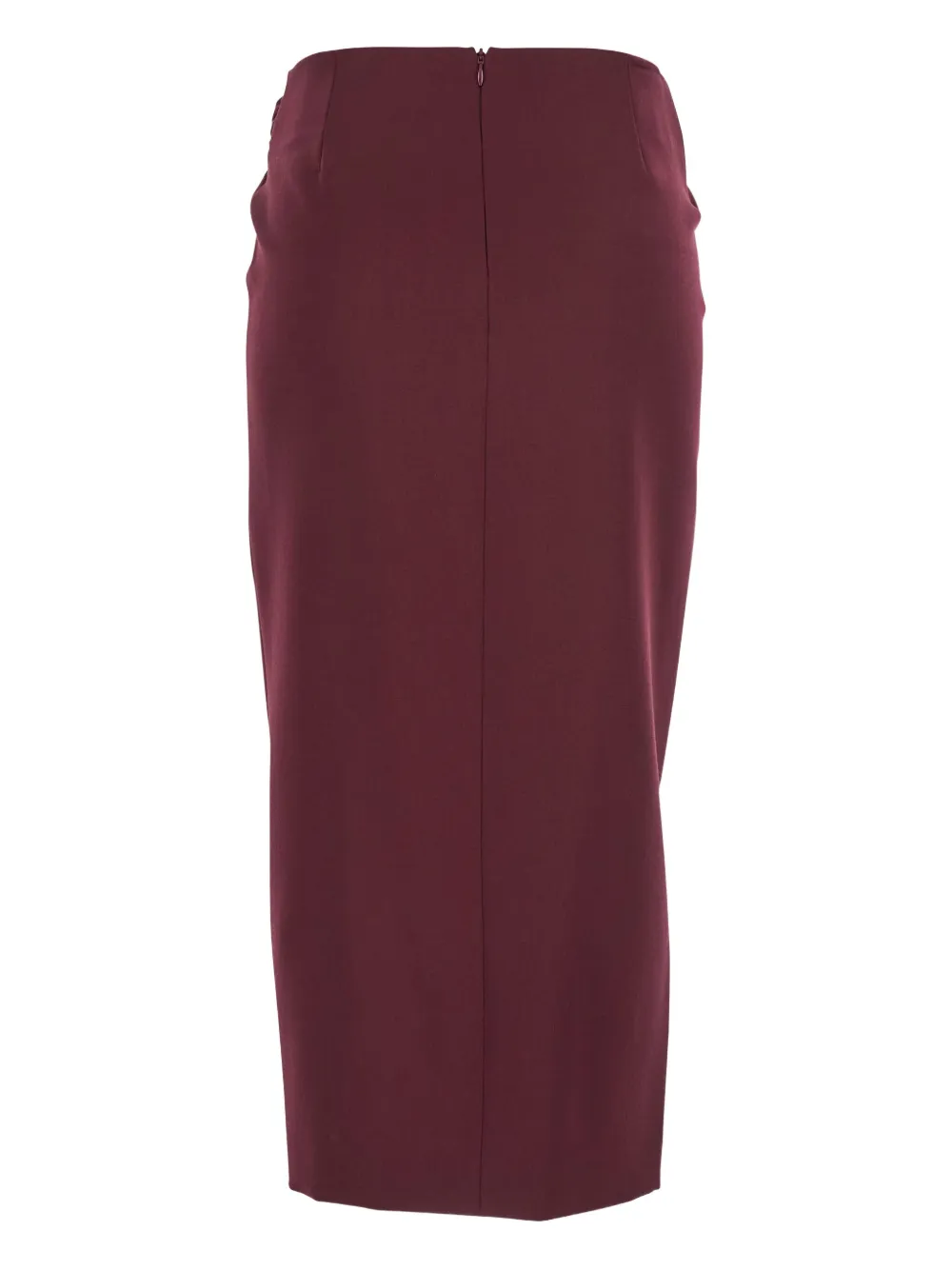 Fusta midi The Attico Draped-Front visiniu, construita din lana, cu inchidere fermoar ascuns la spate, decorata cu drapaj asimetric si accesoriu metalic cu logo gravat, slit inalt pe lateral si tiv drept. Potrivita pentru sezonul toamna/iarna. 100% lana.