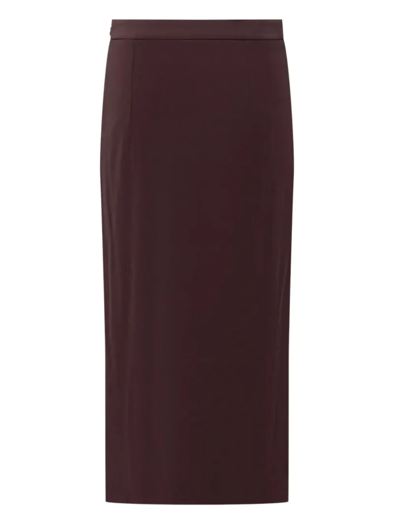 Fusta midi TOM FORD Wrap Pleated violet, din viscoza, cu talie elastica, inchidere cu fermoar pe lateral, pliuri decorative si tiv drept. Potrivita pentru sezonul toamna/iarna. 100% viscoza.