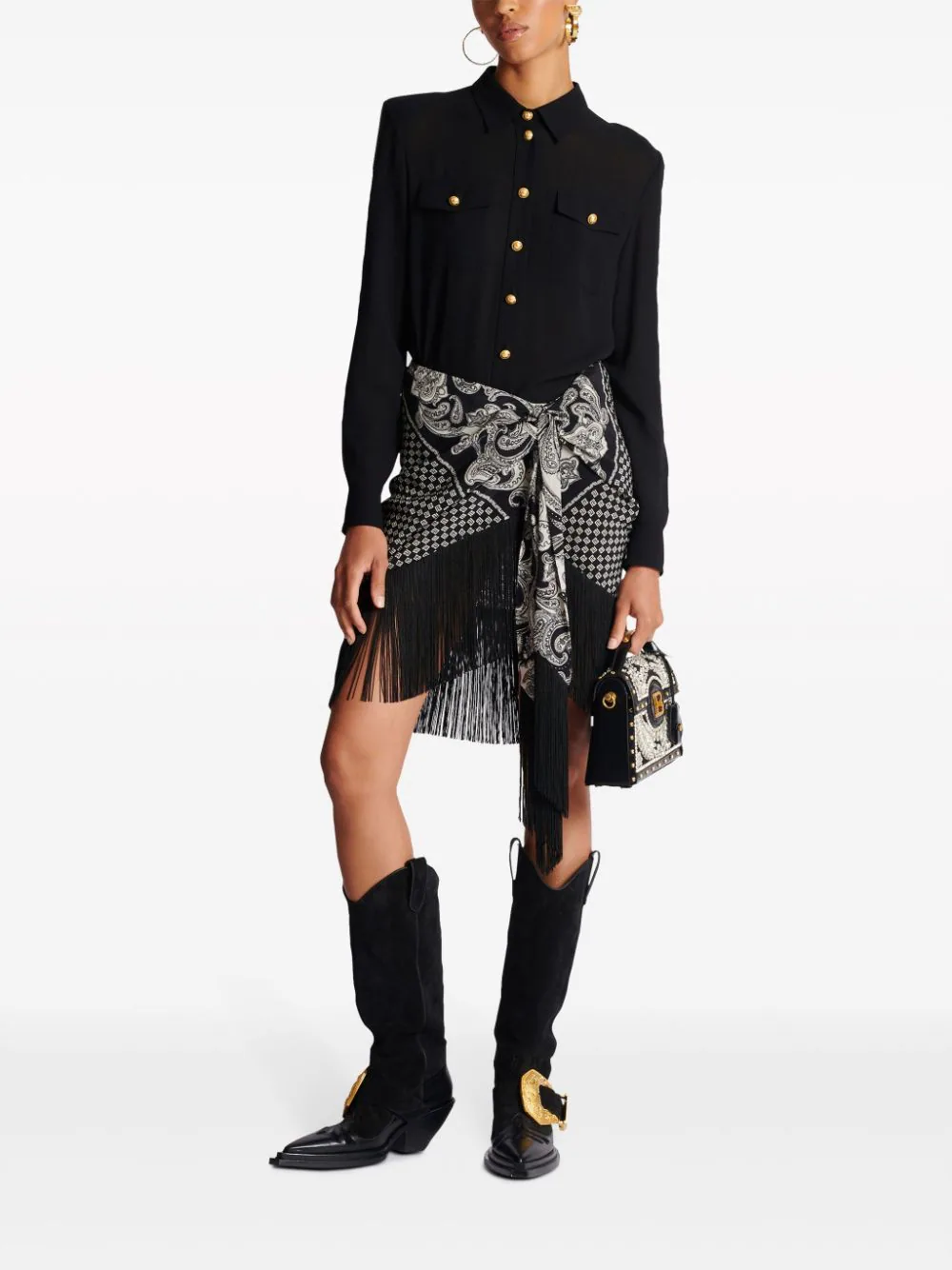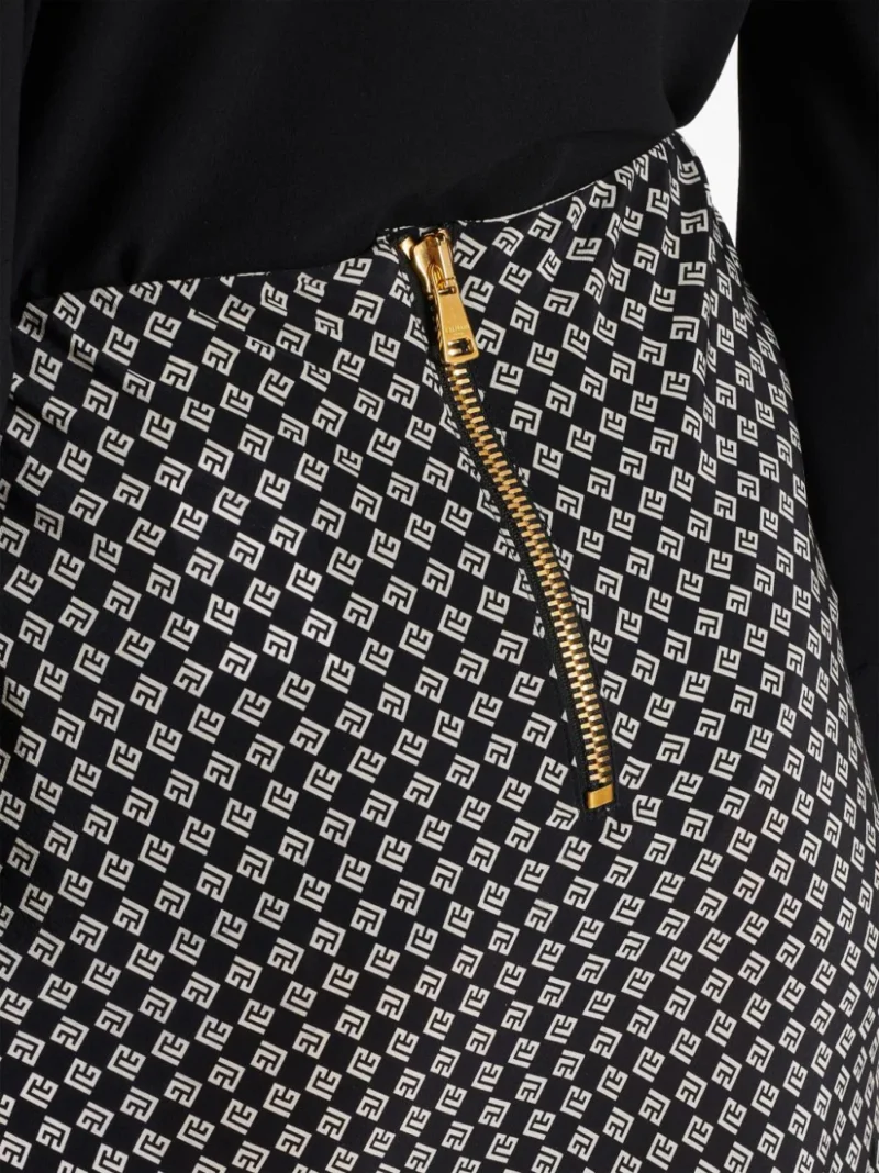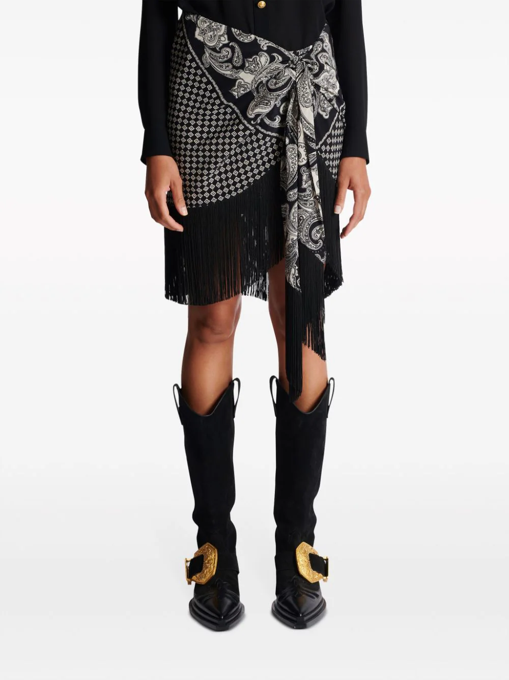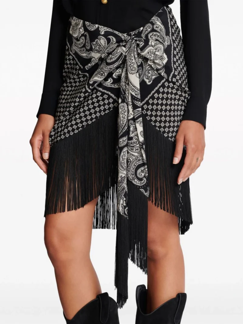 Fusta mini alb/negru din matase, cu talie inalta, inchidere cu fermoar la spate, model monogram si paisley in tesatura pe toata suprafata si tiv asimetric cu franjuri. Potrivita pentru sezonul primavara/vara. 100% matase.