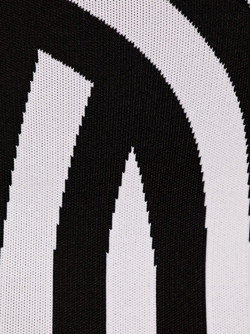 Fusta mini din viscoza, tip pencil, cu talie inalta, inchidere cu fermoar la spate, constructie tricotata, design cu dungi interconectate si tiv drept. Potrivita pentru sezonul toamna/iarna. 100% viscoza.
