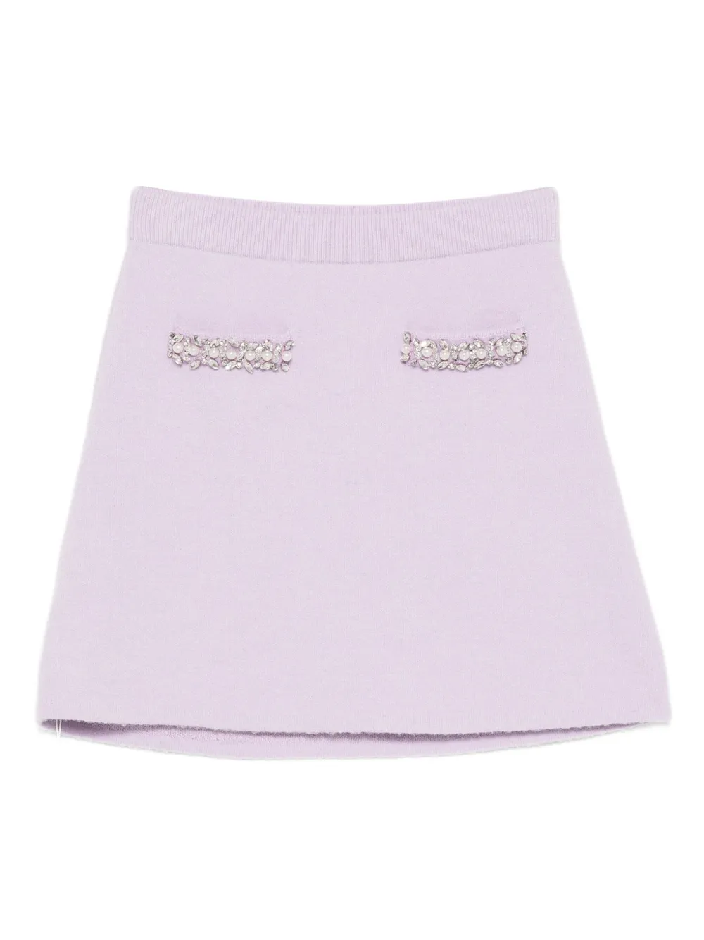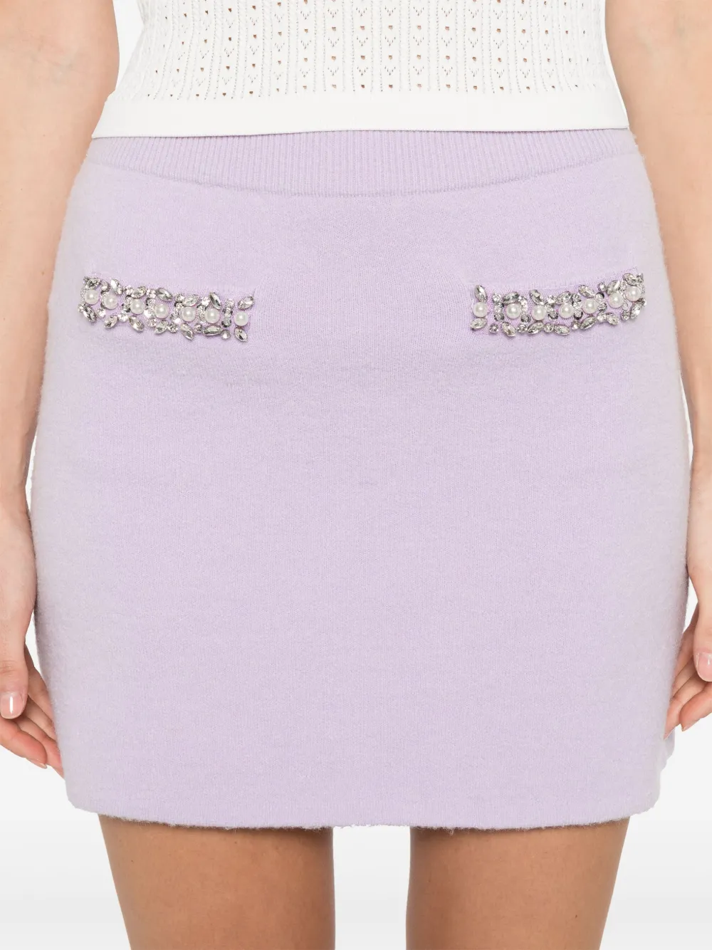 Fusta mini Self-Portrait crystal-trim mov, buzunare decorate, tiv drept, talie ridicata. Potrivita pentru sezonul primavara/vara. 47% vascoza 33% nylon 13% lana 5% alpaca 2% elastan