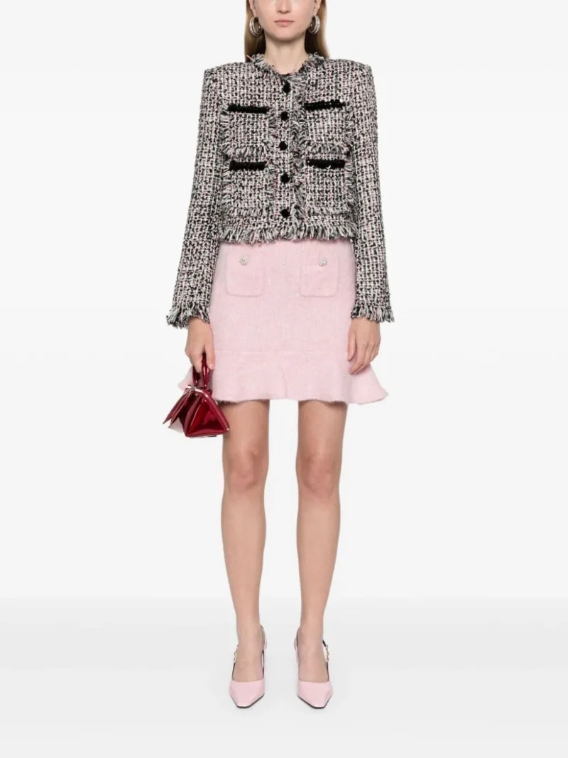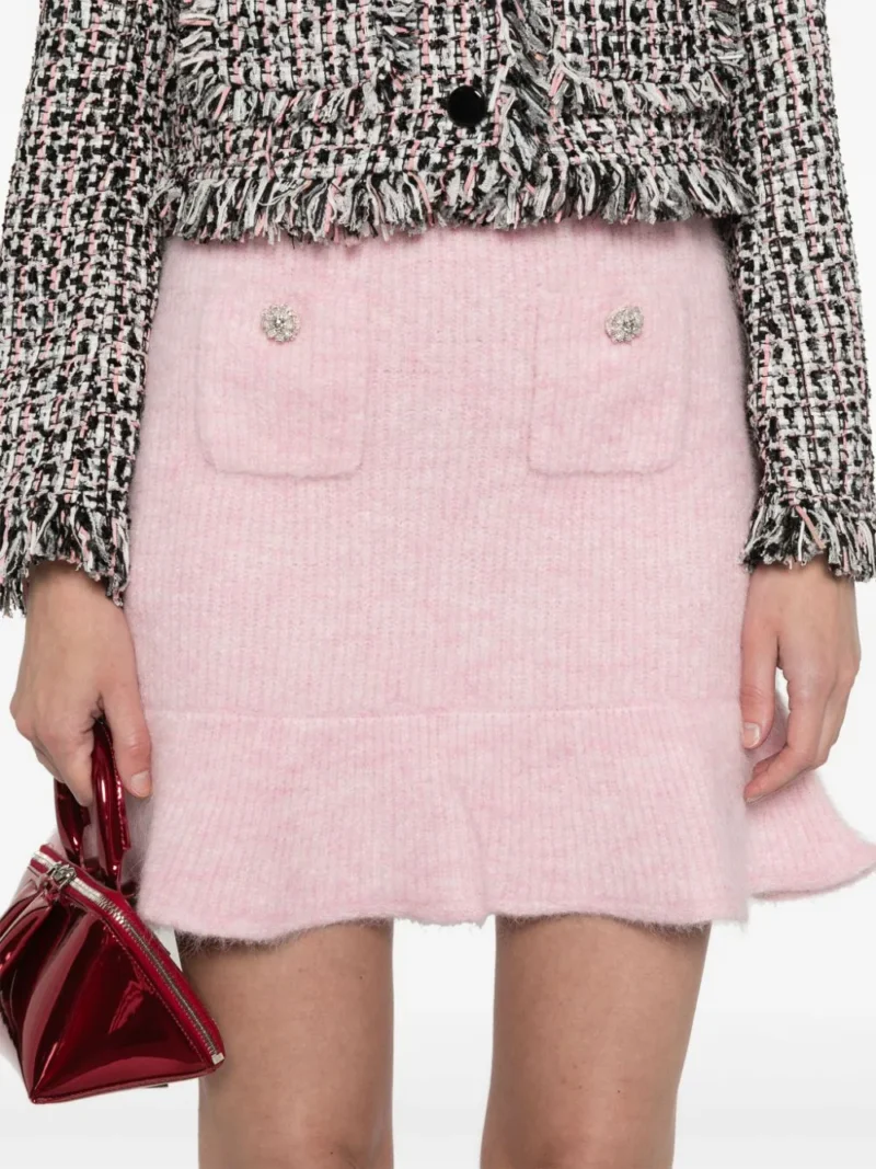 Fusta mini roz din lana, cu talie inalta, inchidere banda elastica, buzunare cu nasturi decorativi aplicate pe partea din fata, constructie tricotata si tiv evazat. Potrivita pentru sezonul toamna/iarna.49% lana; 18% acryl; 14% poliester; 2% elastan.
