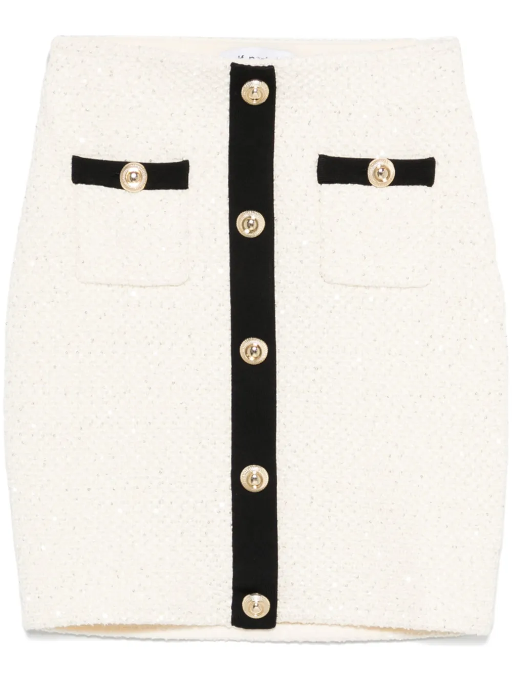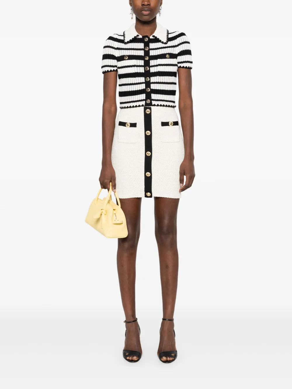 Fusta mini Self-Portrait Sequin-Embellished Knitted alb, din bumbac, cu talie inalta, buzunare aplicate, dungi in contrast, nasturi decorativi aurii si tiv drept. Potrivita pentru sezonul primavara/vara. 47% bumbac; 41% poliester; 12% lana.