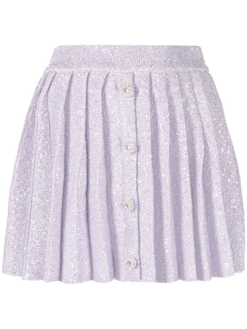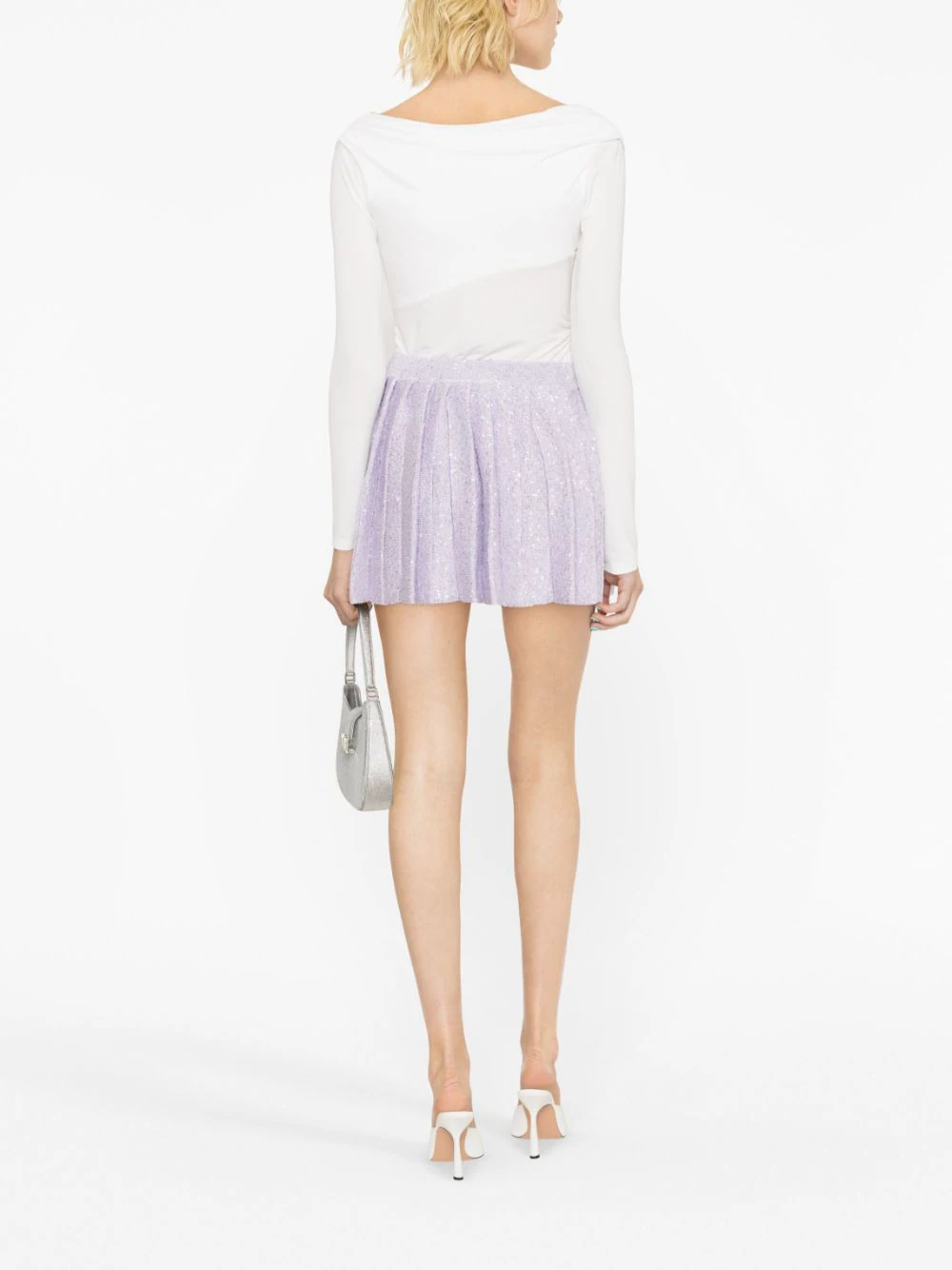 Fusta mini violet din poliester si bumbac, plisata, decorata integral cu paiete sclipitoare, cu talie inalta si inchidere banda elastica, nasturi decorativi aplicati pe partea din fata si tiv drept. Potrivita pentru sezonul toamna/iarna. 72% poliester; 22% bumbac; 6% lana.