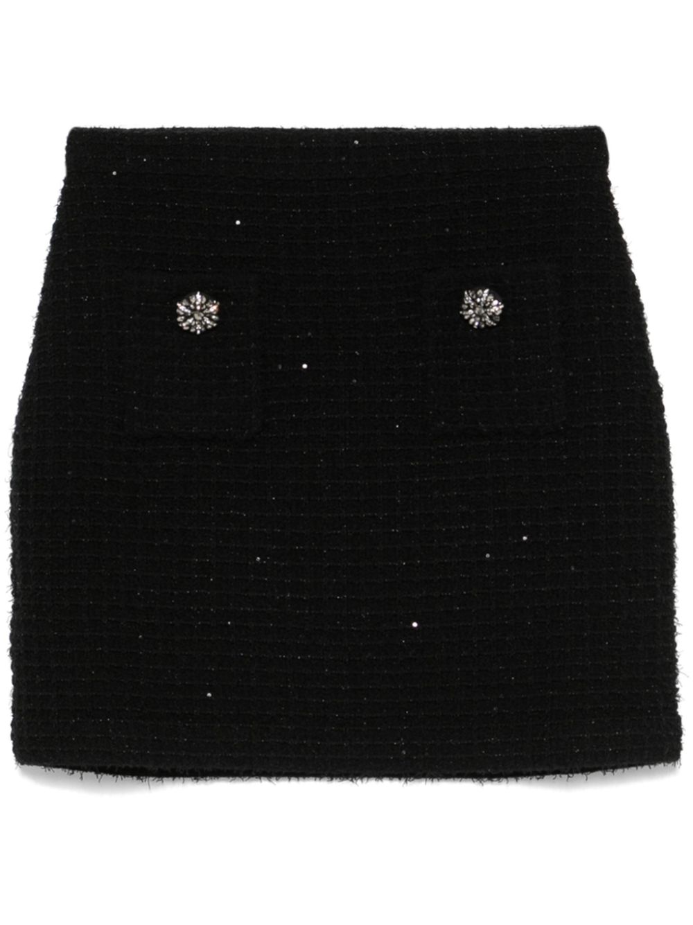 Fusta mini Self-Portrait Textured Knit negru, din mix de materiale, cu talie inalta, inchidere cu fermoar la spate, buzunare aplicate pe partea din fata cu decoratiuni tip nasture, croiala stramta si tiv drept. Potrivita pentru sezonul toamna/iarna. 42% poliester; 29% bumbac; 15% viscoza; 14% poliamida.