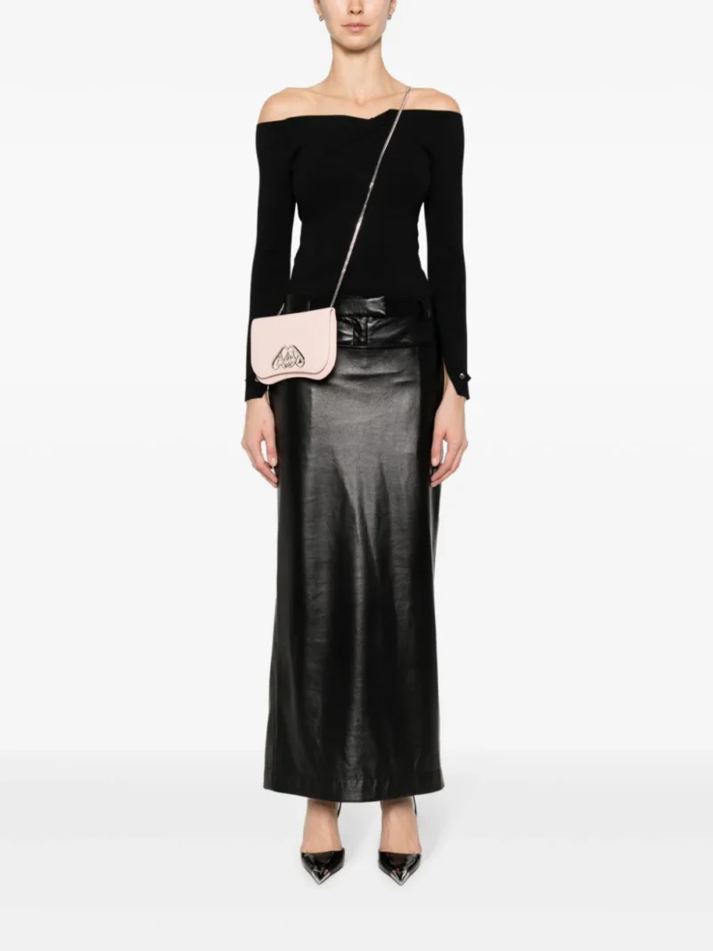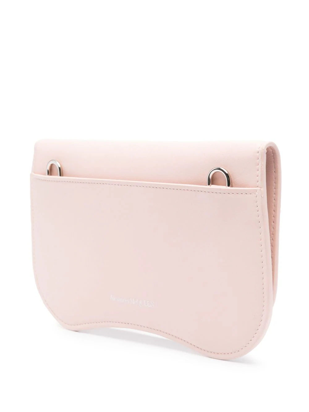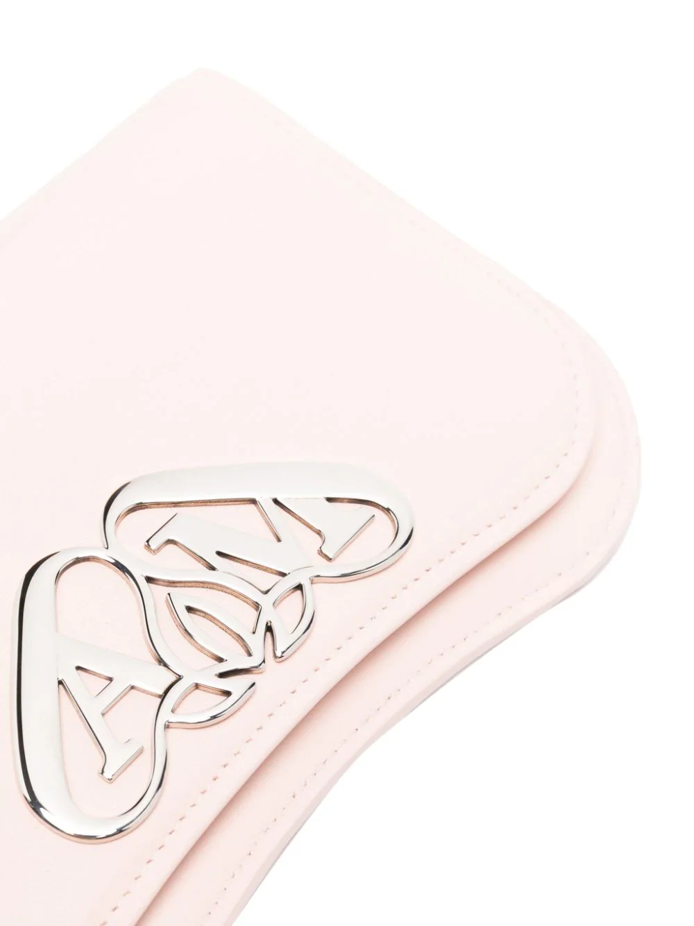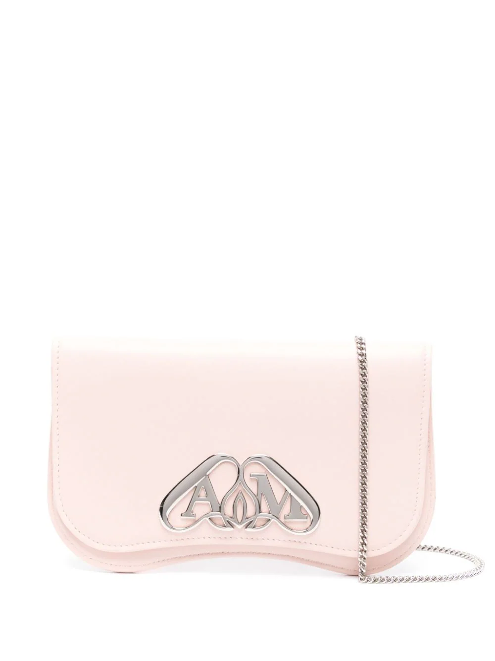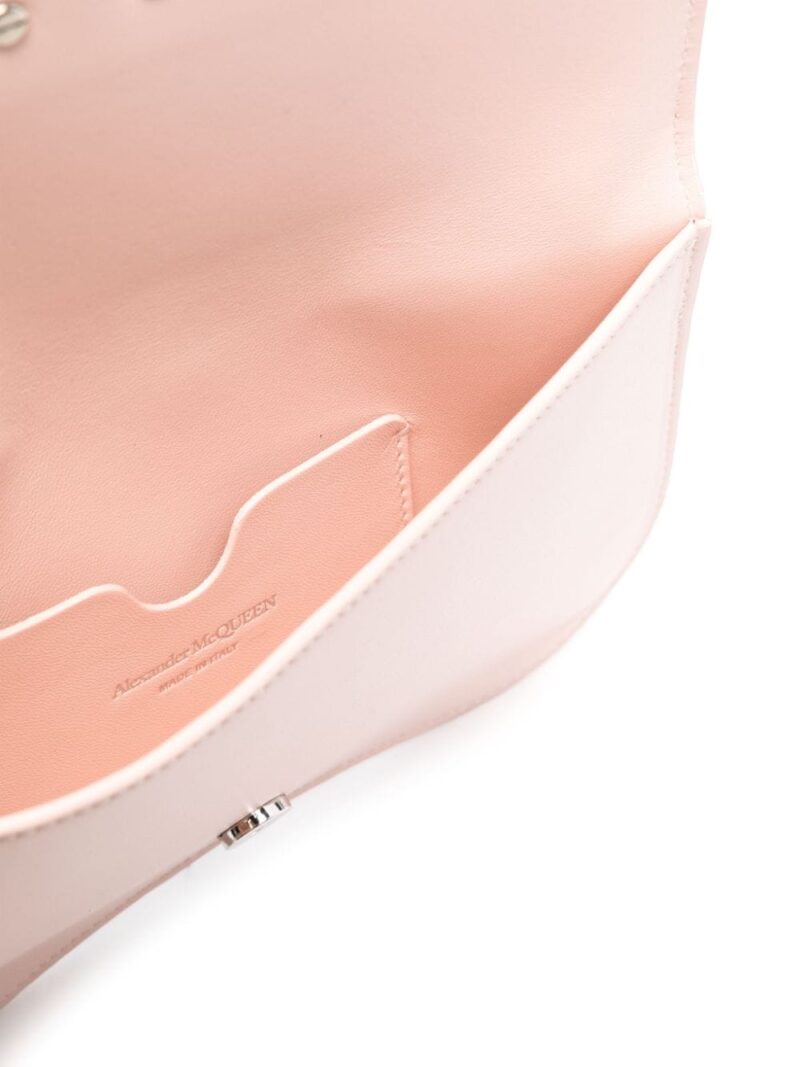 Geanta roz din piele de vitel, cu inchidere clapeta si capsa magnetica, logo AMQ Seal in relief aplicat pe partea din fata, curea de umar din zale detasabila, cusaturi in ton, logo AMQ si buzunar pe partea din spate, captuseala din piele, compartiment principal si buzunar interior cu logo AMQ. Detalii: Inaltime- 12 cm; latime- 21 cm. 100% piele de vitel.