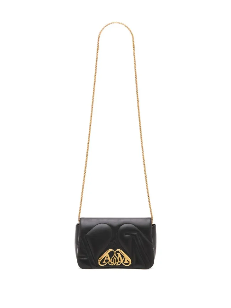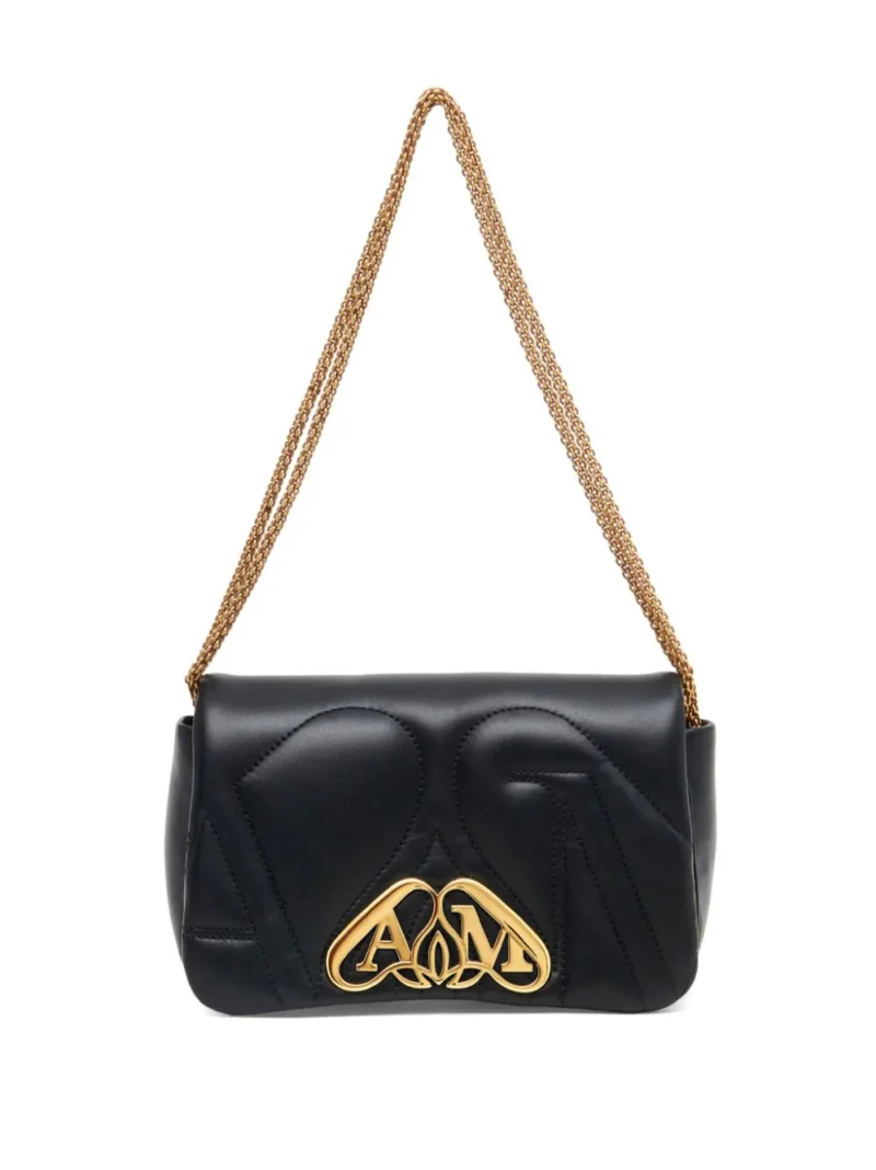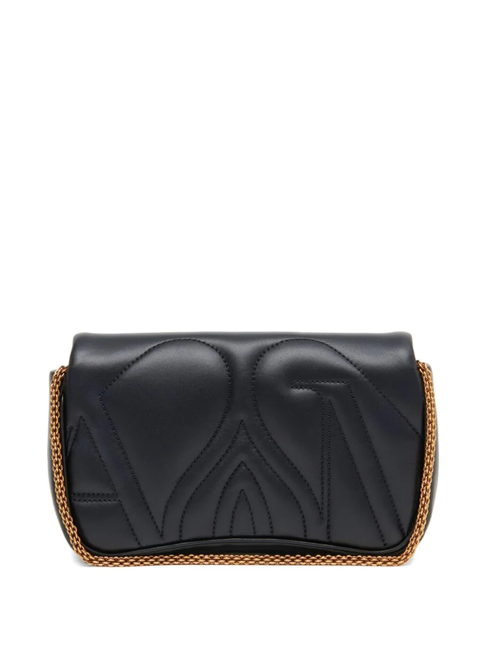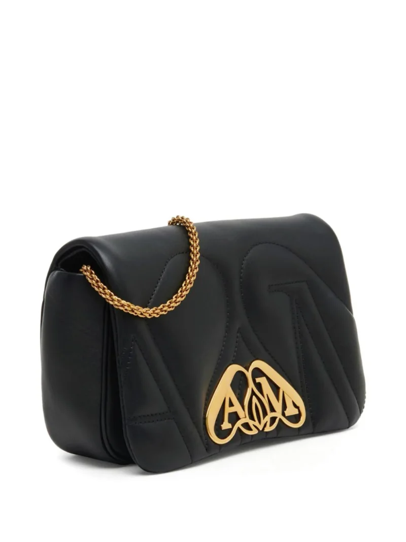 Geanta neagra din piele de miel, matlasata integral, cu logo metalic AMQ The Seal aplicat pe partea din fata, inchidere cu clapeta, buzunar interior, captuseala din piele si curea de umar din zale ajustabila si detasabila. Detalii: Inaltime- 13 cm; latime- 22 cm; adancime- 5 cm. 100% piele de miel.