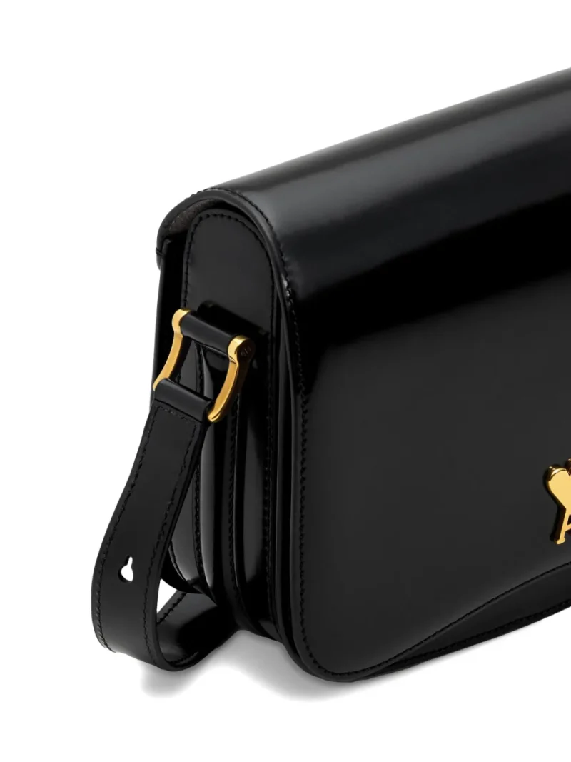 Geanta Ami Paris Black Glazed Leather Paris Paris negru, unisex, confectionata din piele cu efect glazurat, bareta de umar ajustabila, compartiment central cu buzunar aplicat, feronerie aurie, logo Ami metalic aplicat pe partea superioara si captuseala din piele intoarsa de miel. Detalii: Latime- 20cm; Ianltime- 15cm ; Adancime- 4,5cm; 100% piele de miel; 100% piele de vitel.