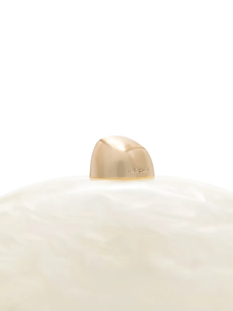 Geanta Clutch Cult Gaia Eviana bej, din acriloc si alama, cu forma ovala, inchidere magnetica, logo Cult Gaa gravat, compartiment principal si bareta pentru umeri formata din zale. 100% acrilic; 100% alama.