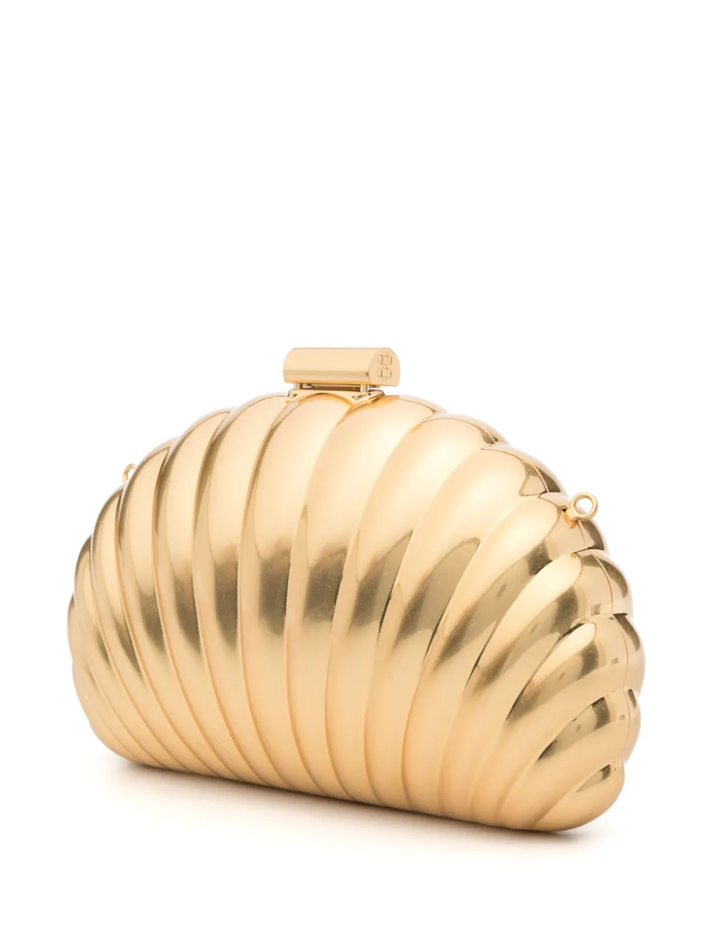 Geanta clutch Simkhai Monet Shell-Motif auriu, realizata din metal, in forma de scoica, cu bareta de umar snake-chian, logo gravat la exterior, compartiment principal si inchidere magnetica. Detalii: Adacime- 5 cm; Inaltime – 13 cm; Latime- 20 cm; Bareta- 113 cm. 100% metal.