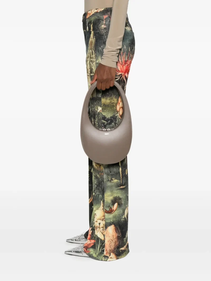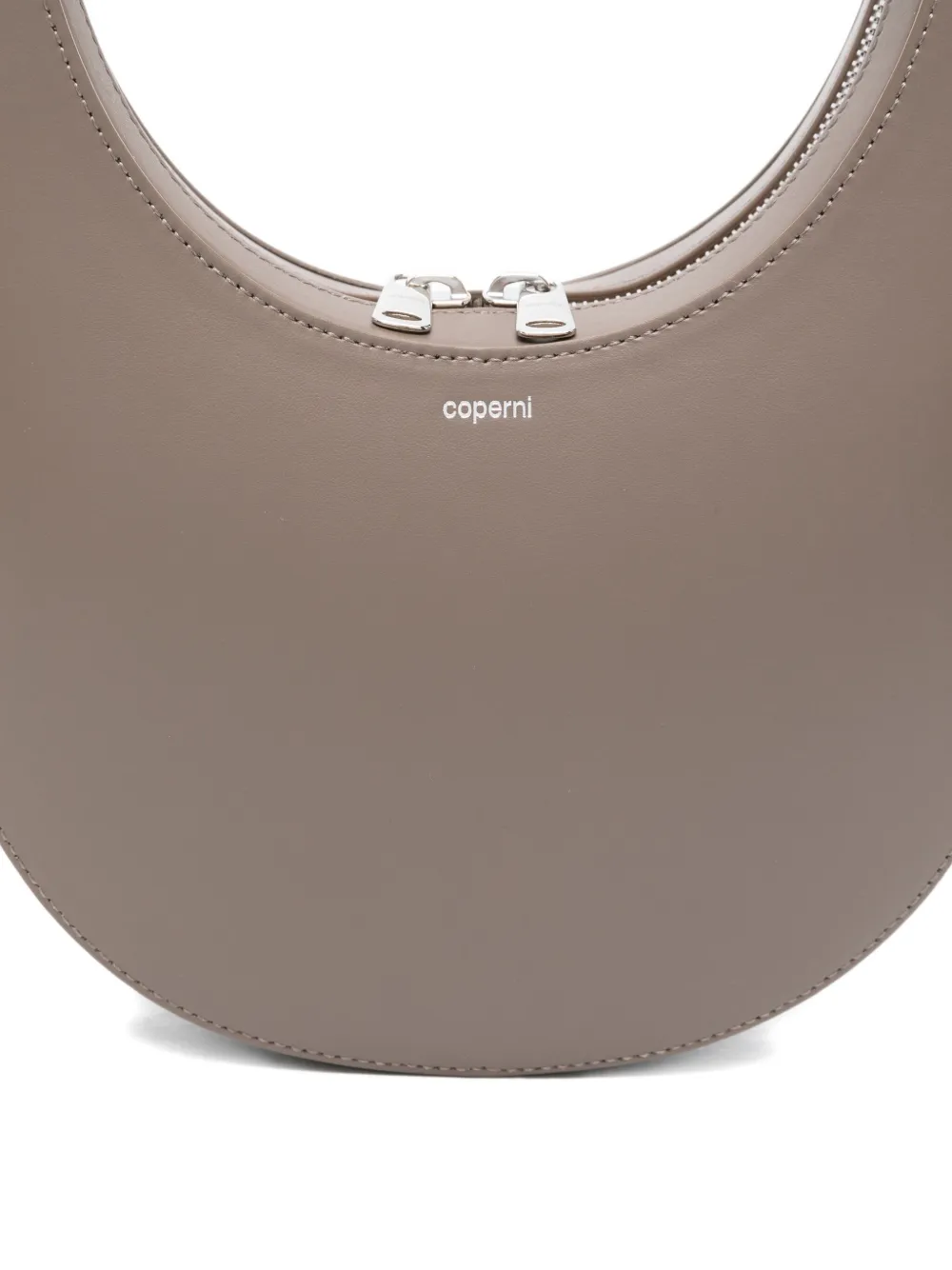 Geanta Coperni Swipe Tote bej, din piele, cu forma ovala si design sculptural, inchidere cu fermoar circular, compartiment compact cu buzunar interior si logo gravat pe partea superioara. 100% piele.