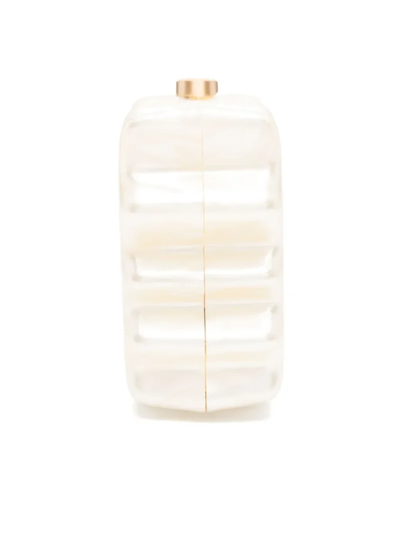 Geanta Cult Gaia Paloma Clutch ecru, din acril, cu inchidere magnetica, un singur compartiment principal, contur asimetric si efect perlat. 100% acrilic.
