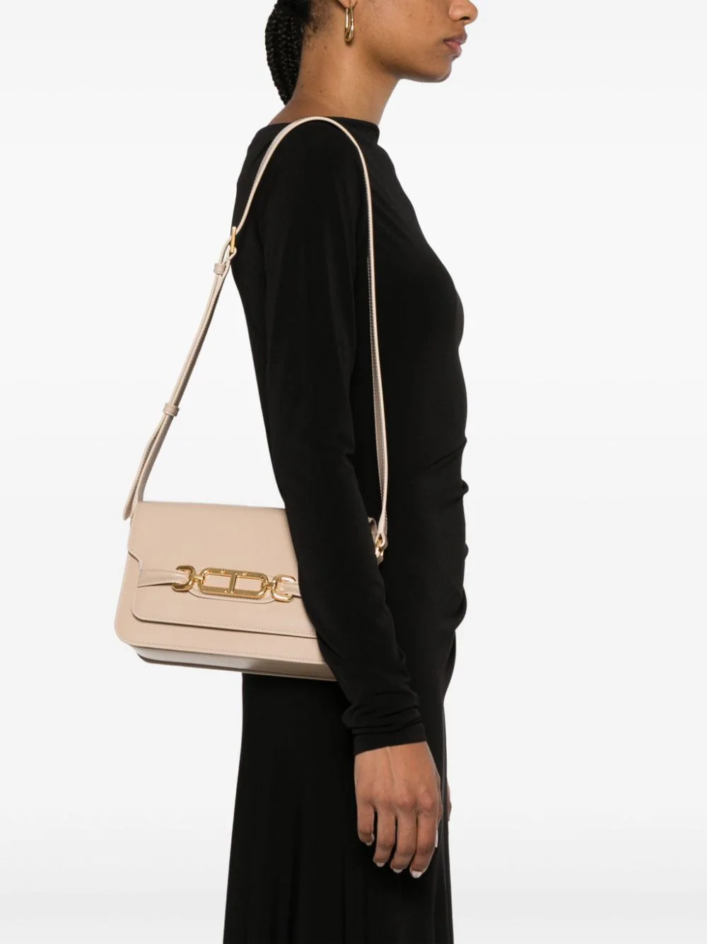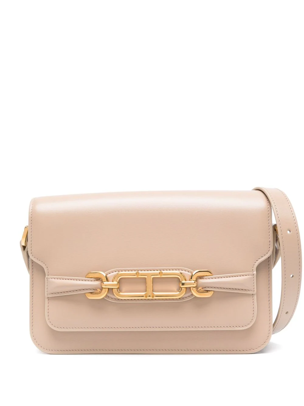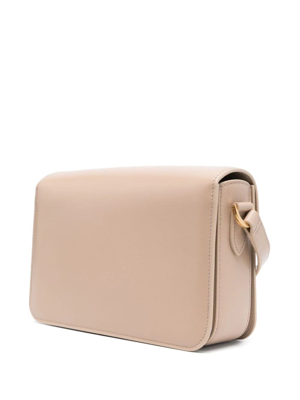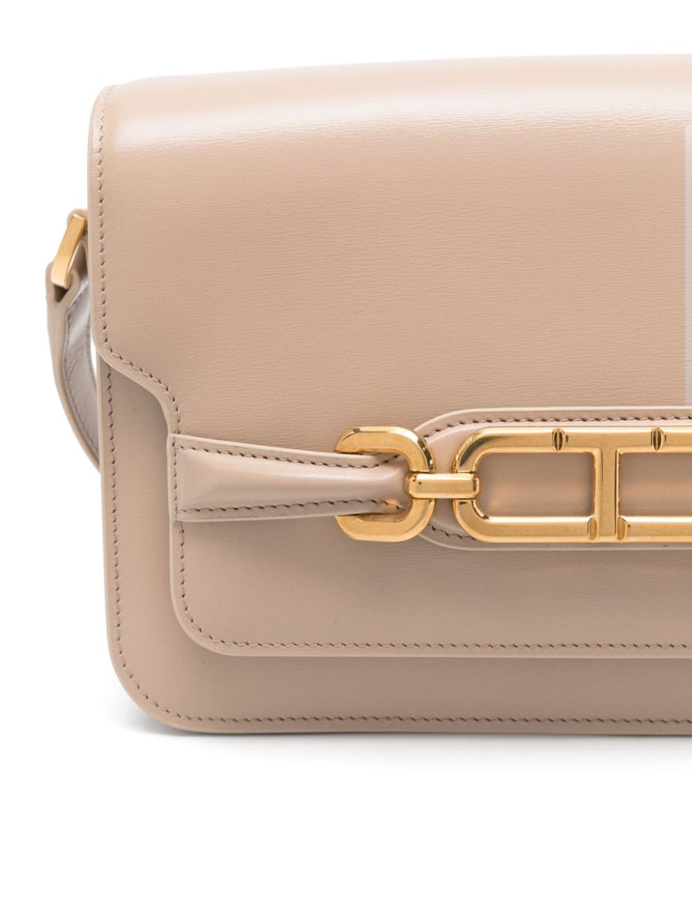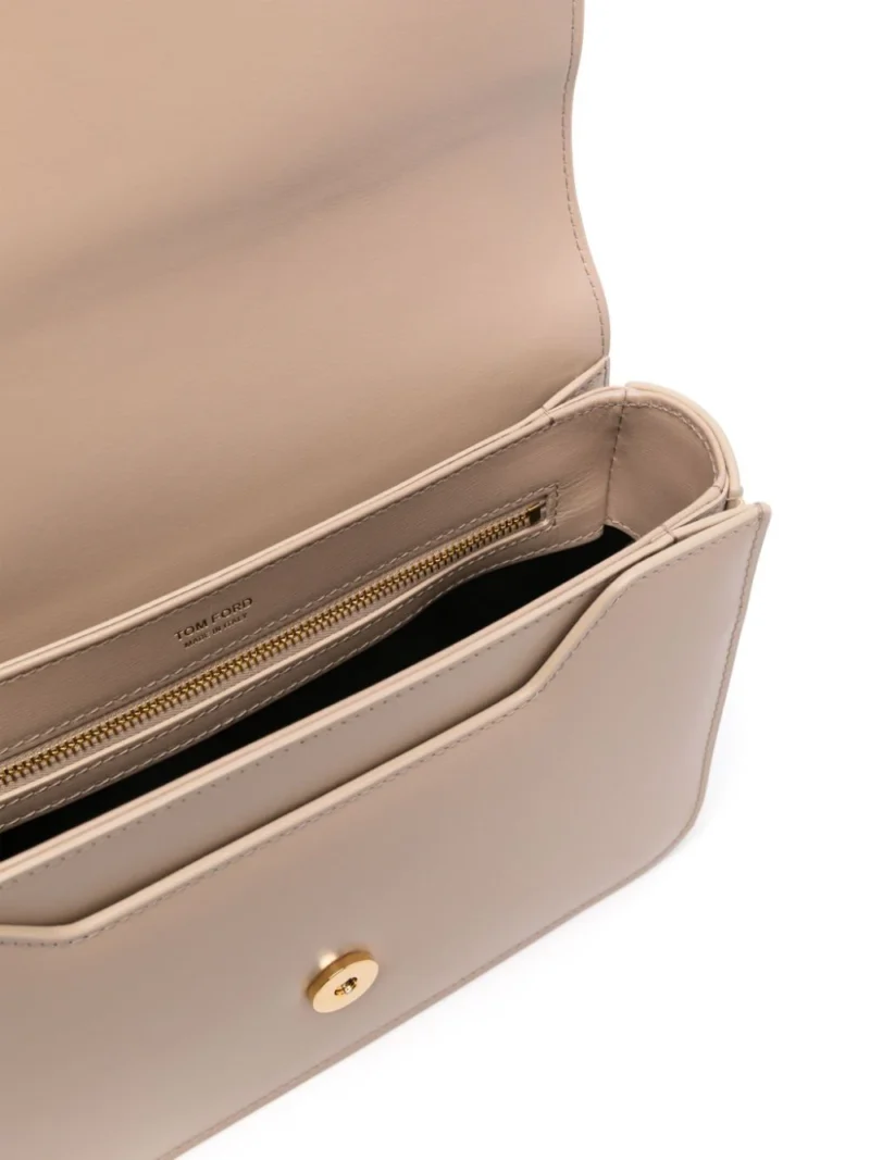 Geanta de umar TOM FORD Medium bej, cu forma dreptunghiulara, inchidere clapeta si capsa, un compartiment principal, buzunar interior cu inchidere fermoar, curea cu decoratiune metalica atasata pe partea din fata si bareta de umar ajustabila. Detalii: Latime- 23,5 cm; Adancime – 8cm; inaltime- 16cm; Bareta- 116cm. 100% boss taurus; 100% alama; 100% piele de miel.