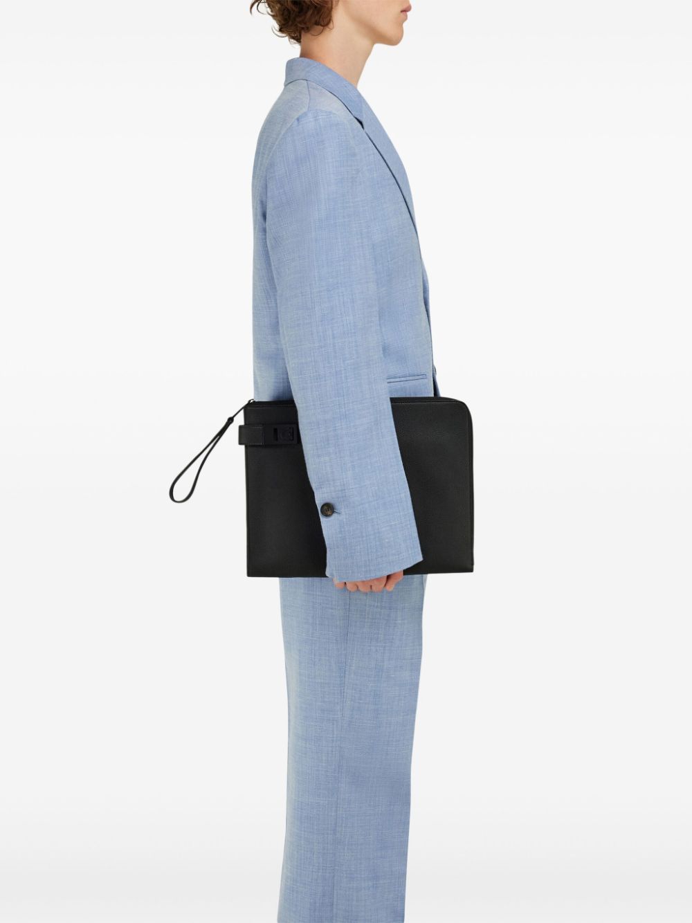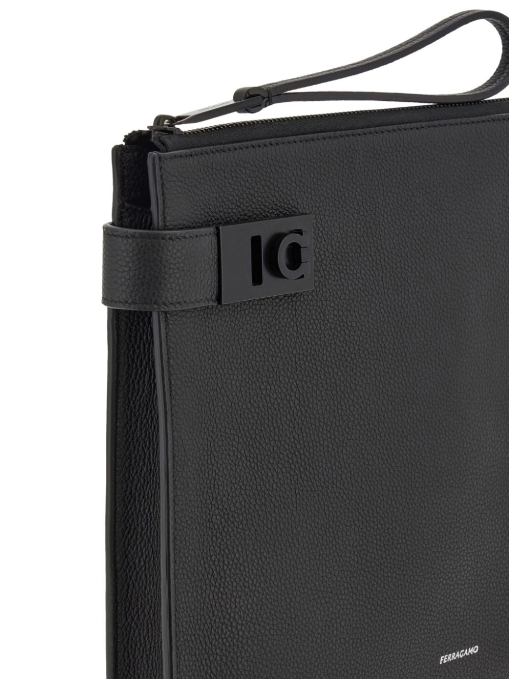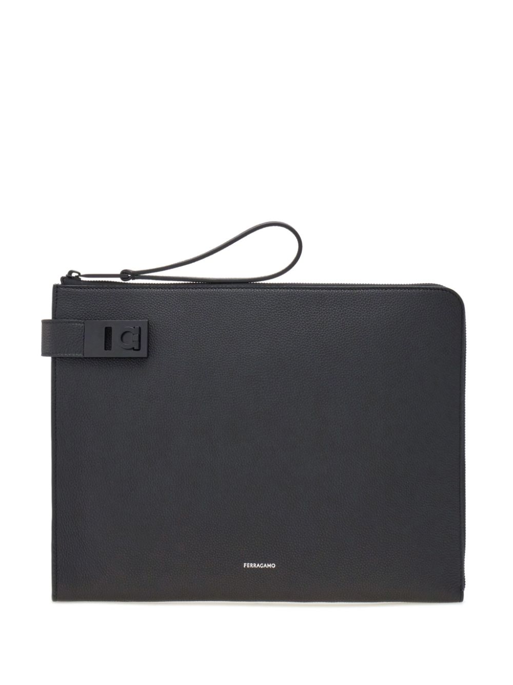 Geanta Ferragamo Gancini-Buckle Clutch negru, din piele, cu forma dreptunghiulara, inchidere cu fermoar, buzunare tip welt pe interior, buzunar exterior cu fermoar, curea de umar detasabila, logo metalic Gancini si logo Ferregamo gravat.