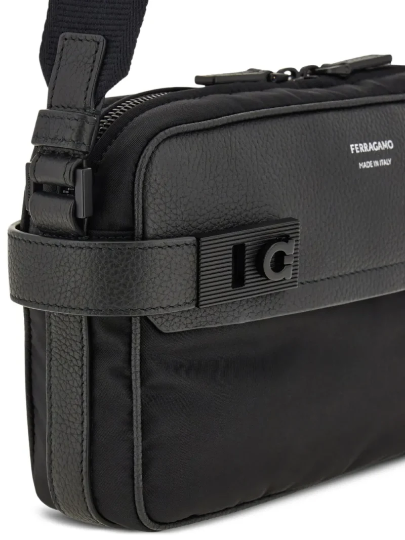 Geanta Ferragamo Gancini-Buckle Shoulder negru, din piele, cu inchidere fermoar bidirectionl, compartiment principal, bareta pentru umar ajustabila, barete laterale cu logo metalic Gancini si captuseala din bumbac. 80% bumbac; 20% piele.