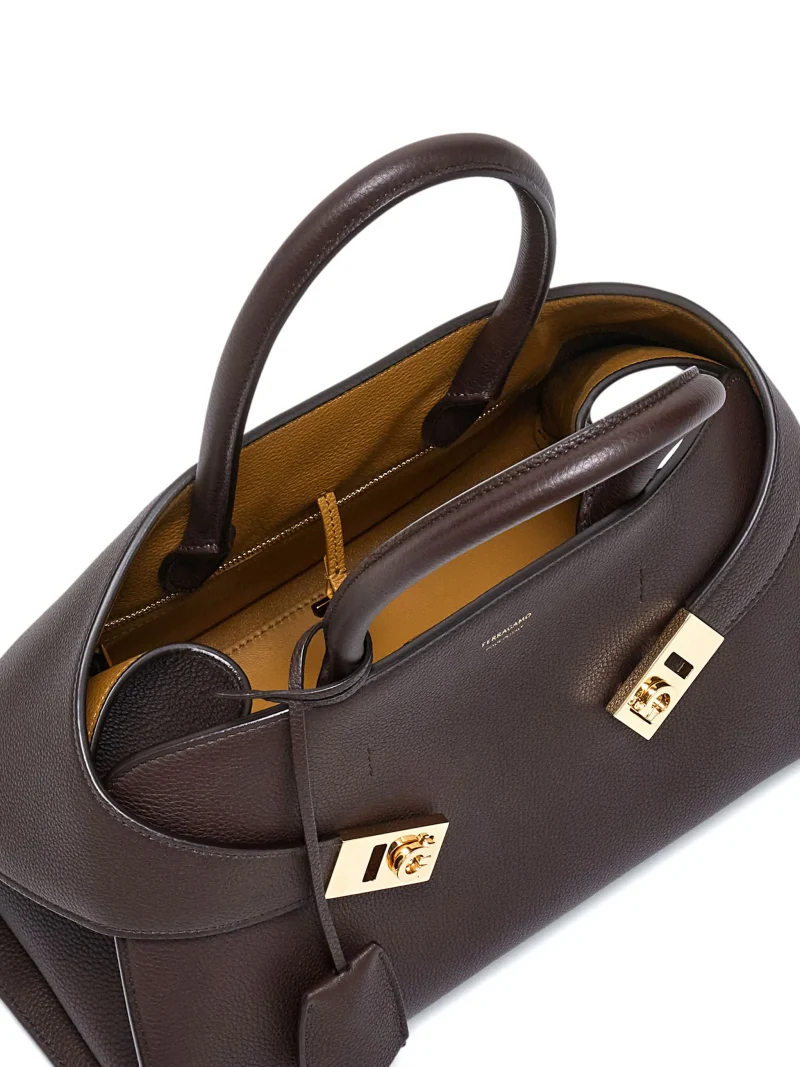 Geanta maro din piele naturala, cu manere circulare, inchizatori metalice tip flip lock cu forma emblematica FERRAGAMO Gancini, compartiment incapator, logo FERRAGAMO imprimat pe partea din fata, accesoriu detasabil prins de maner, buzunar interior, captuseala din piele si curea de umar ajustabila si detasabila. Detalii: Inaltime- 22 cm; latime- 31,5 cm; adancime- 19 cm. 100% piele de vitel; 100% piele de miel.