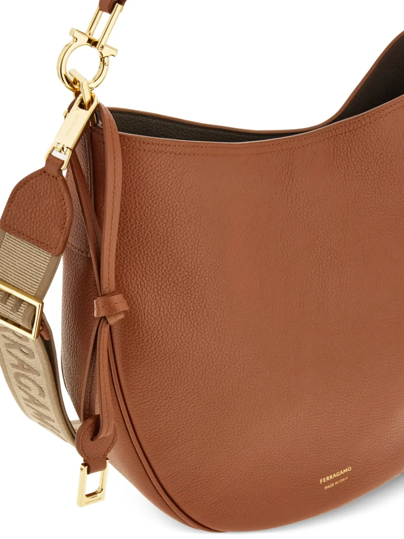 Geanta Ferragamo maro din piele, cu inchidere cu curea, un maner superior detasabil, bretea de umar ajustabila si detasabila si buzunar interior cu fermoar.100% piele