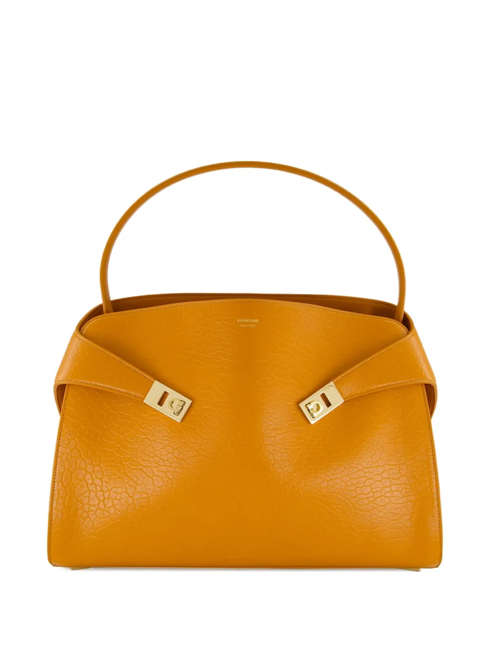 Geanta Ferragamo medium Hug Maxi-Grain Leather portocaliu. din piele texturata, cu maner superior, decorata cu barete si catarame metalice tip flip lock cu forma emblematica FERRAGAMO Gancini, compartiment incapator, logo FERRAGAMO imprimat pe partea din fata, buzunar interior, captuseala din piele si curea de umar ajustabila si detasabila. Detalii: Inaltime- 25,4 cm; latime- 33,7 cm; adancime- 15,4 cm. 100% piele de vitel.