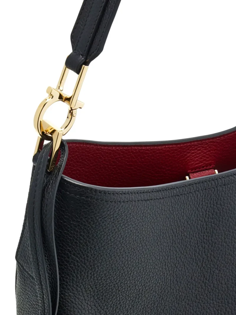 Geanta Ferragamo North-South Leather Shoulder negru, din piele, cu forma ovala, inchidere cu magnet, compartiment principal, buzunar interior cu fermoar, logo Ferragamo gravat si bareta pentru umeri ajustabila. Detalii: Inaltime- 27,5cm; Latime 30,5cm; Adancime- 9cm. 100% piele de vitel.