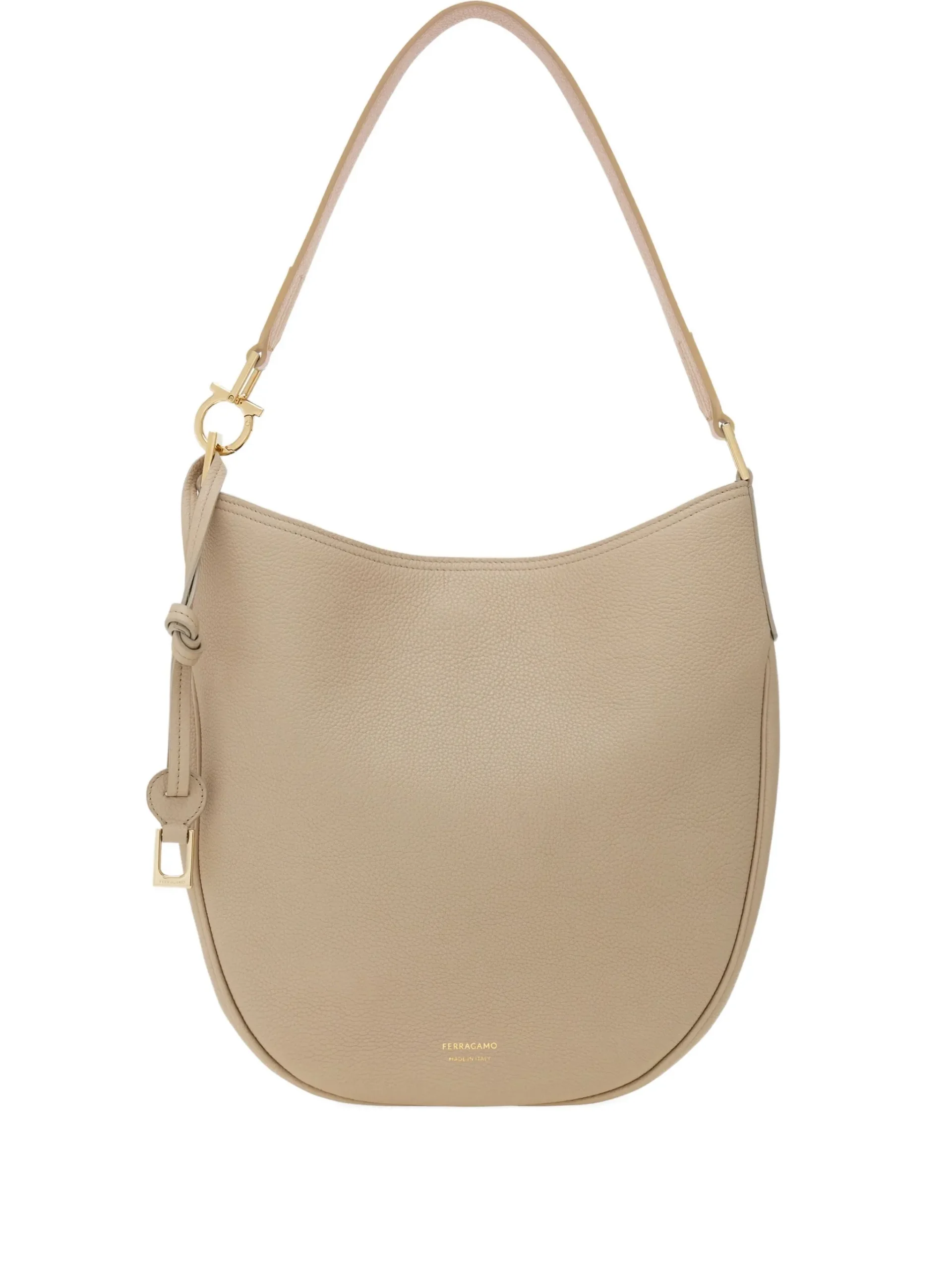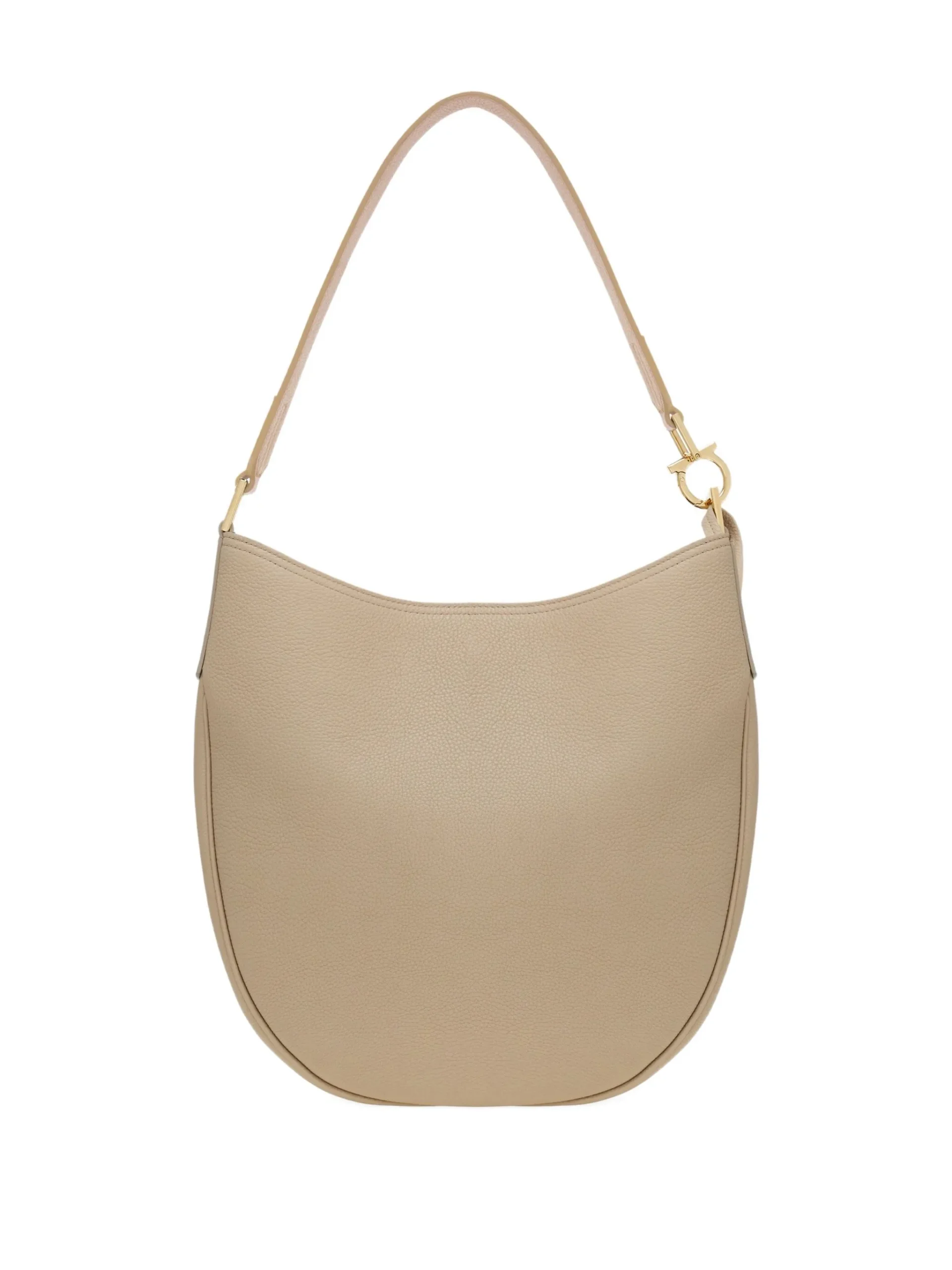 Geanta Ferragamo North-South tote bej, curea de umar reglabila, buzunar pe interior cu fermoar, placa Gancini. 100% piele