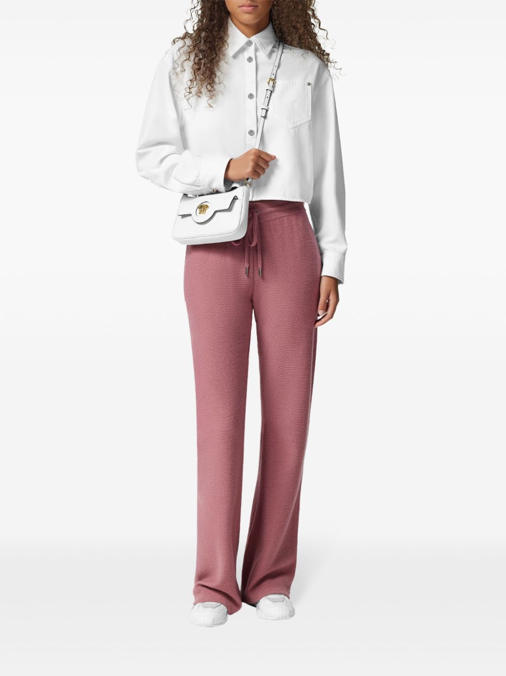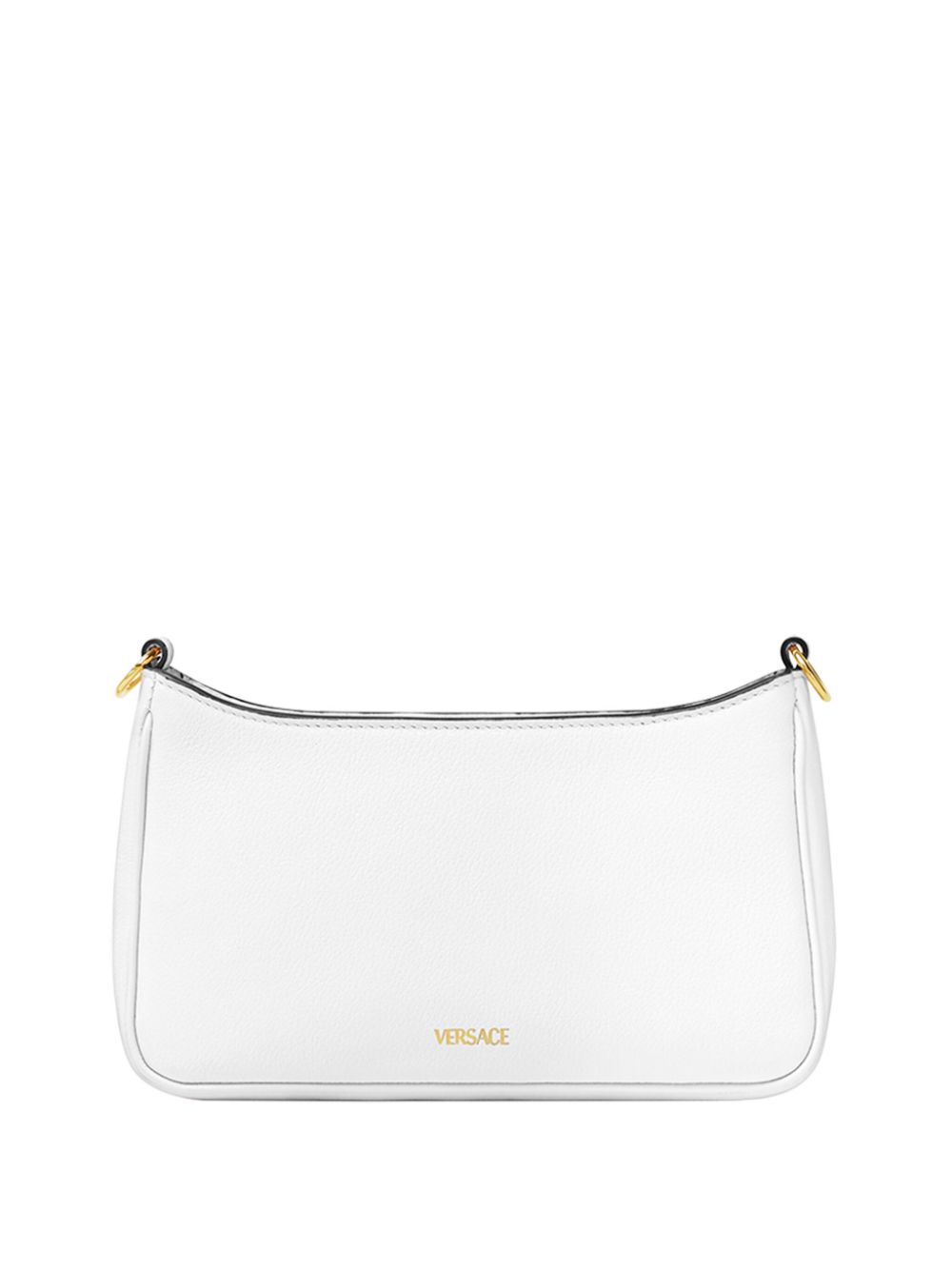 Geanta mini Versace La Medusa alb, din piele, cu inchidere fermoar, bareta din zale pentru umar, buzunar interior, buzunar exterior cu inchidere clapeta si logo metalic Medusa auriu aplicat. Detalii: Inaltime- 12,5 cm; Latime- 22 cm; Adancime- 4,5 cm. 100% piele de vitel; 100% bumbac.
