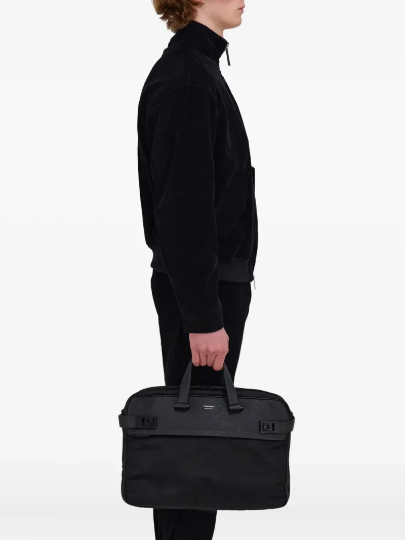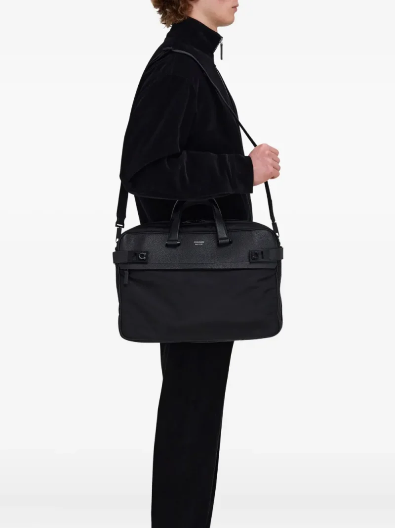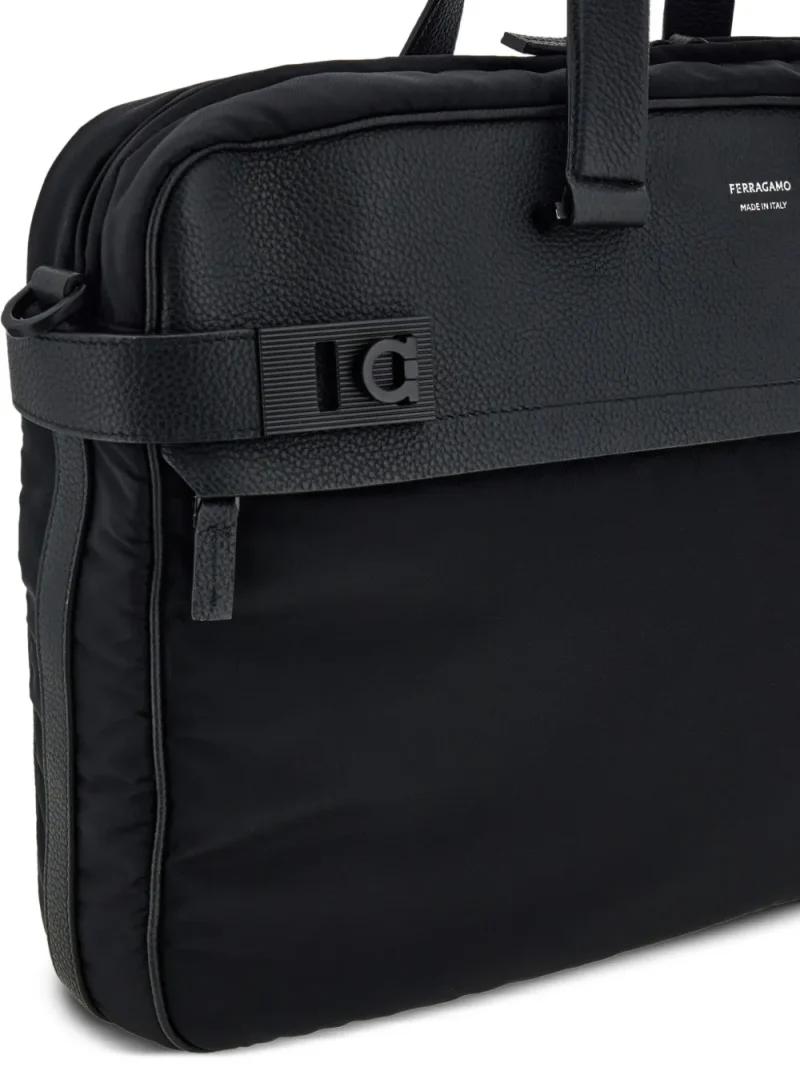 Geanta laptop Ferragamo Gancini-Motif negru, din textil si piele, cu inchidere fermoar bidirectional, doua compartimente principale, buzunar exterior cu fermoar, bareta pentru umar ajustabila, barete cu logo metalic Gancini si captuseala din bumbac. 80% textil; 20% piel de vitel.