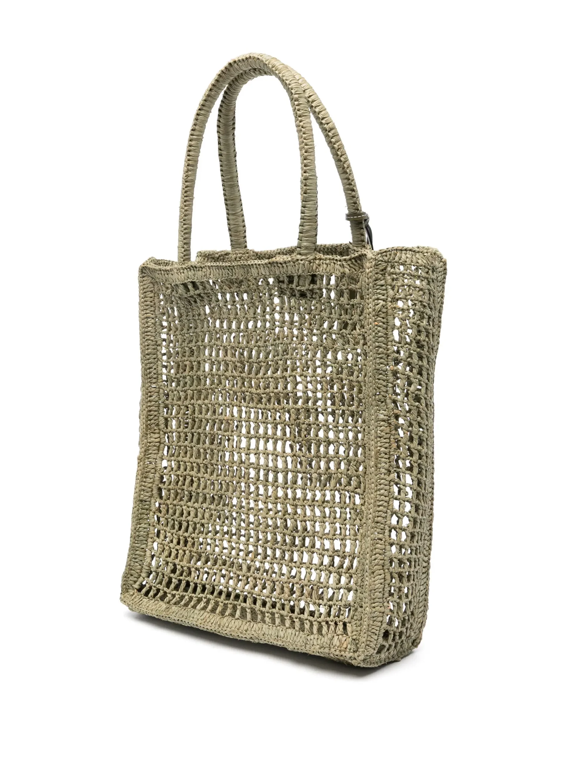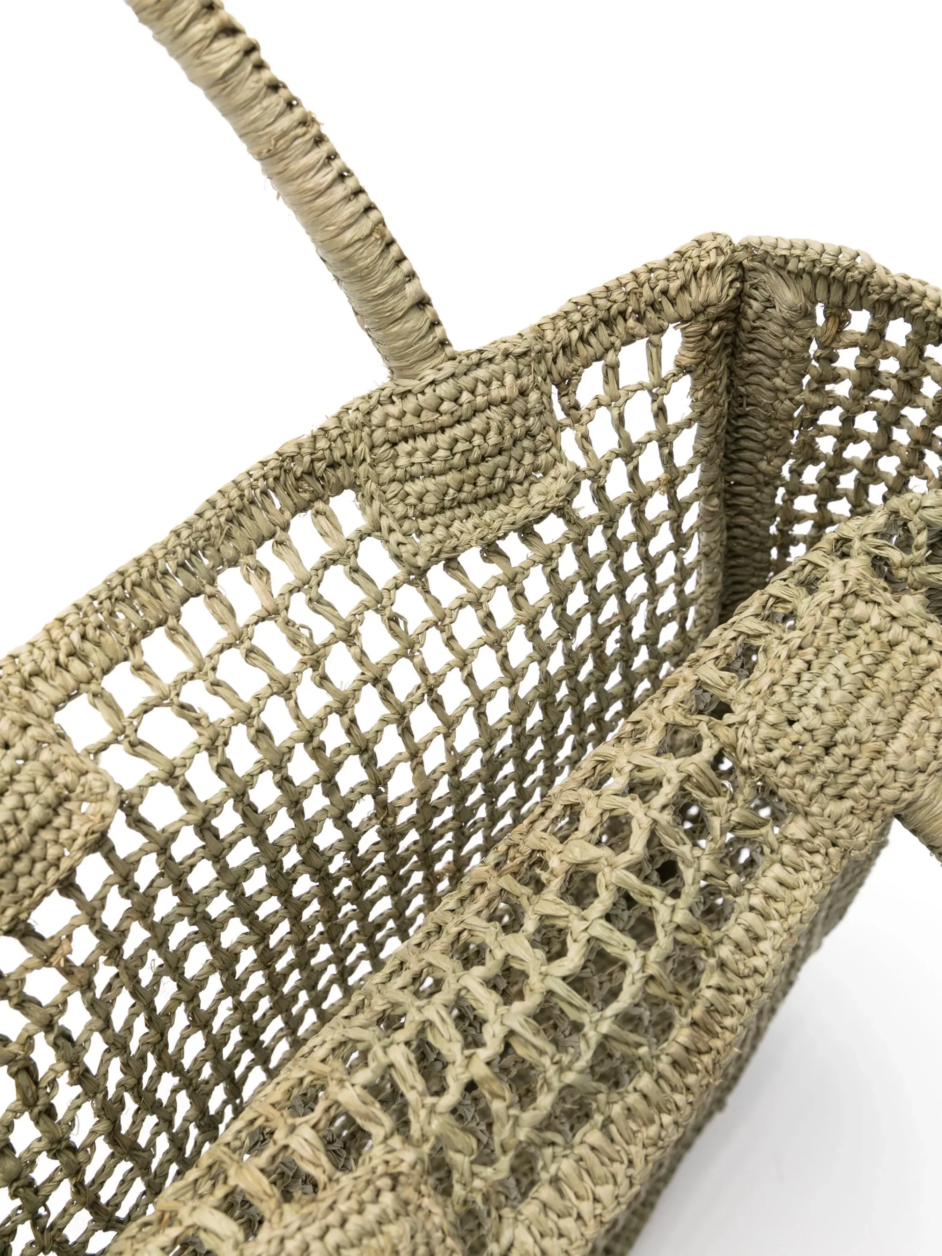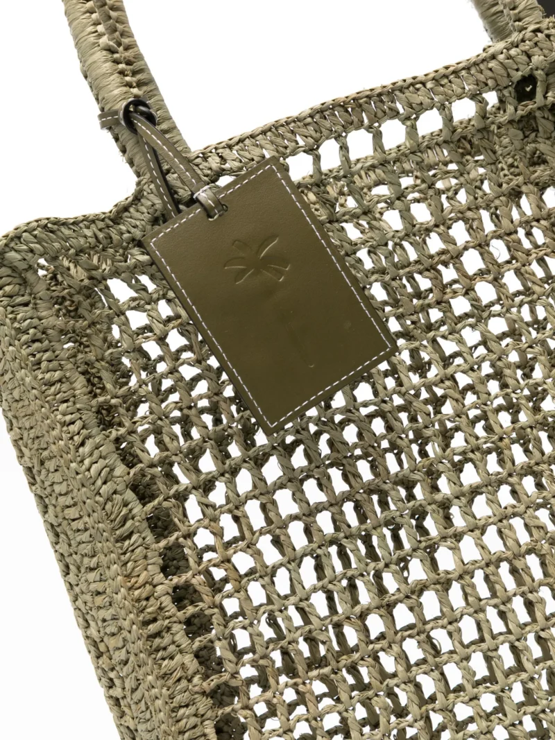 Geanta verde impletita din rafie, fara inchidere, cu manere circulare, compartiment incapator si accesoriu din piele. Detalii: Inaltime- 32 cm; latime- 29 cm; adancime- 9 cm; maner- 17 cm. 100% rafie.