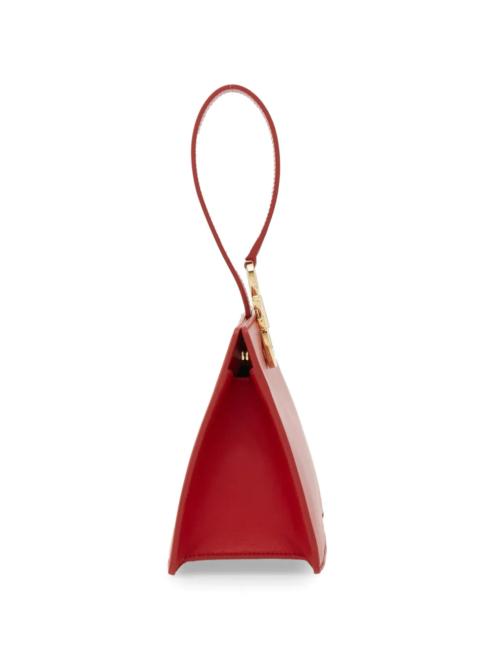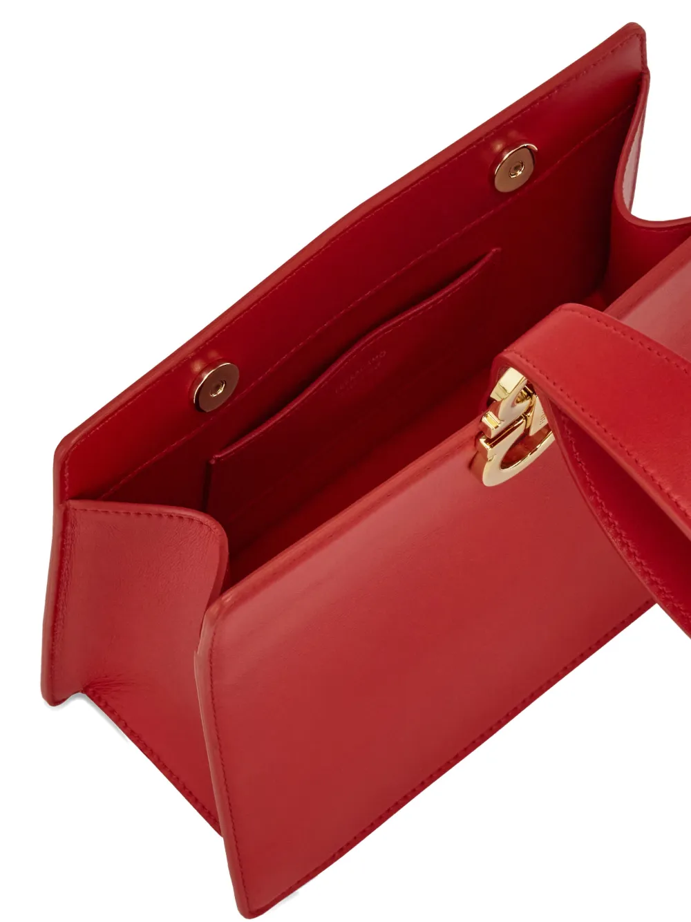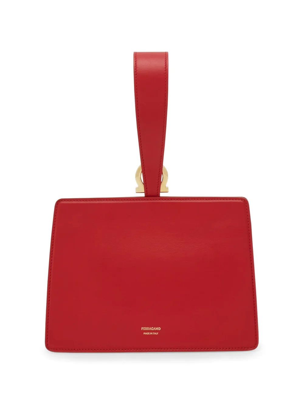Geanta mini clutch Ferragamo rosu, design minimalist inspirat din anii ’60, realizata din piele cu finisaj semi lucios, forma patrata, captuseala finisata cu un slot elegant pentru carduri si maner din piele decorat cu logi Gancini metalic. 100% piele de vitel; 100% piele de miel. Detalii- Inaltime- 15 cm; Adancime- 8 cm; Latime- 20,5 cm.