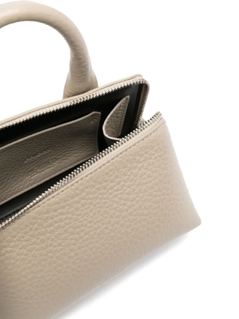 Geanta mini The Attico Friday ecru, din piele, realizata din piele cu aspect lucios, forma sculpturala, maner circular, inchidere cu fermoar bidirectional, logo The Attico gravat si bareta pentru umeri ajustabila. 100% piele de vite; 30% poliester; 100% poliuretan; 100% piele de vitel; 70% bumbac.