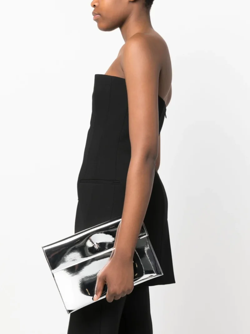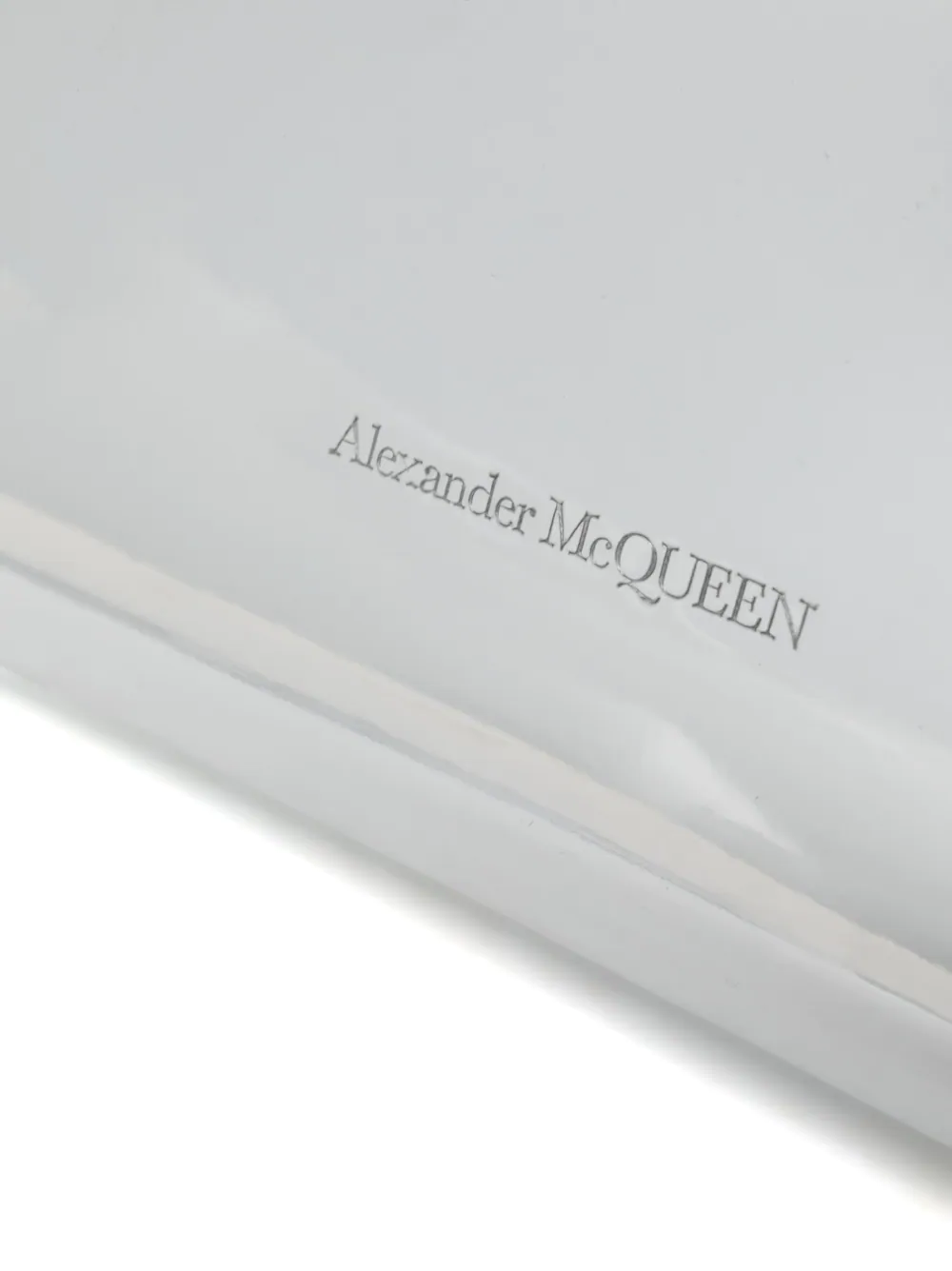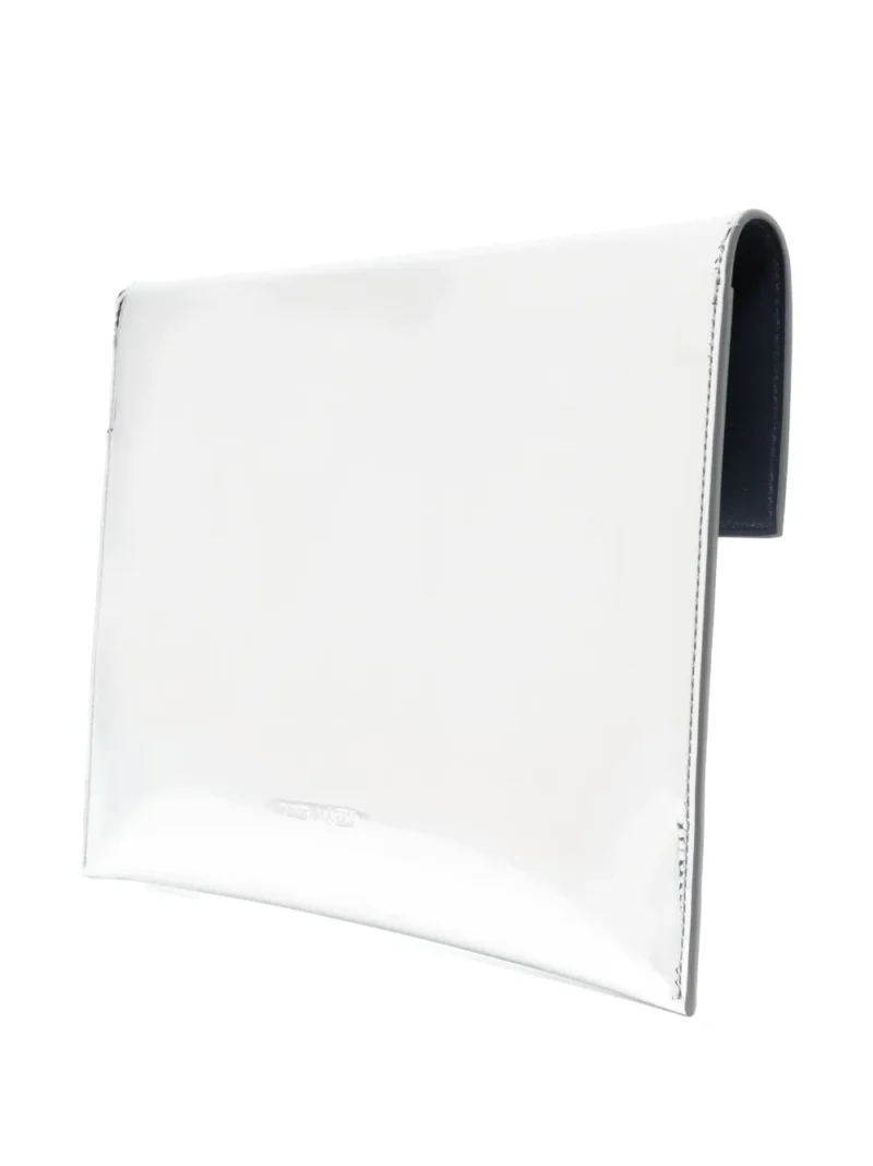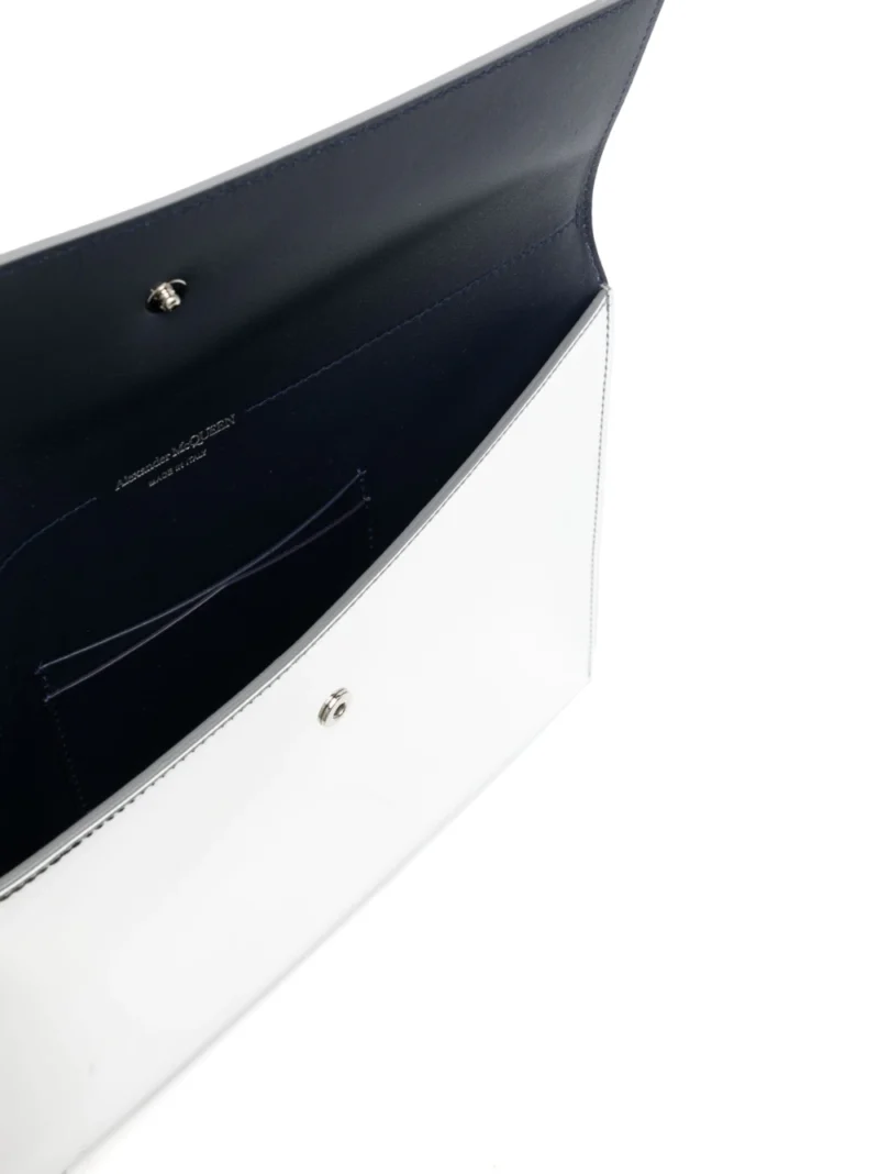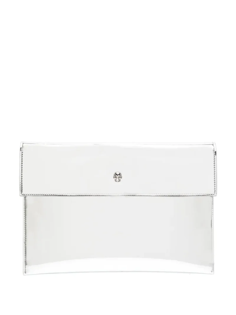 Geanta plic argintie din piele de vitel, tip clutch, cu inchidere clapeta si capsa, craniu AMQ aplicat pe partea din fata, captuseala din piele si sloturi pentru carduri la interior. Detalii: Inaltime- 20 cm; latime- 28 cm; adancime- 2 cm. 100% piele de vitel.