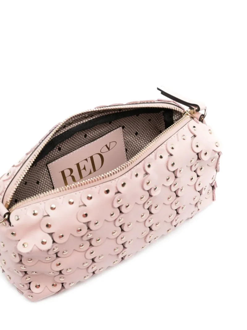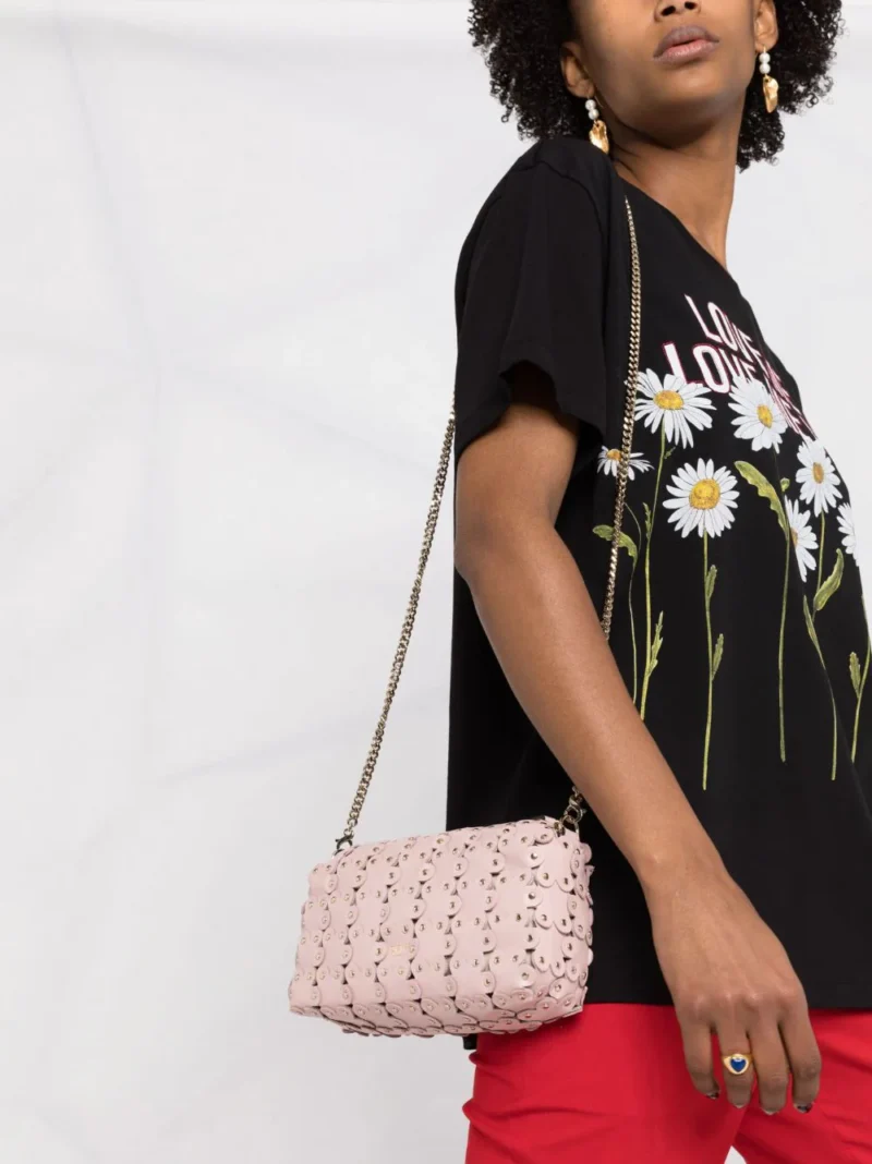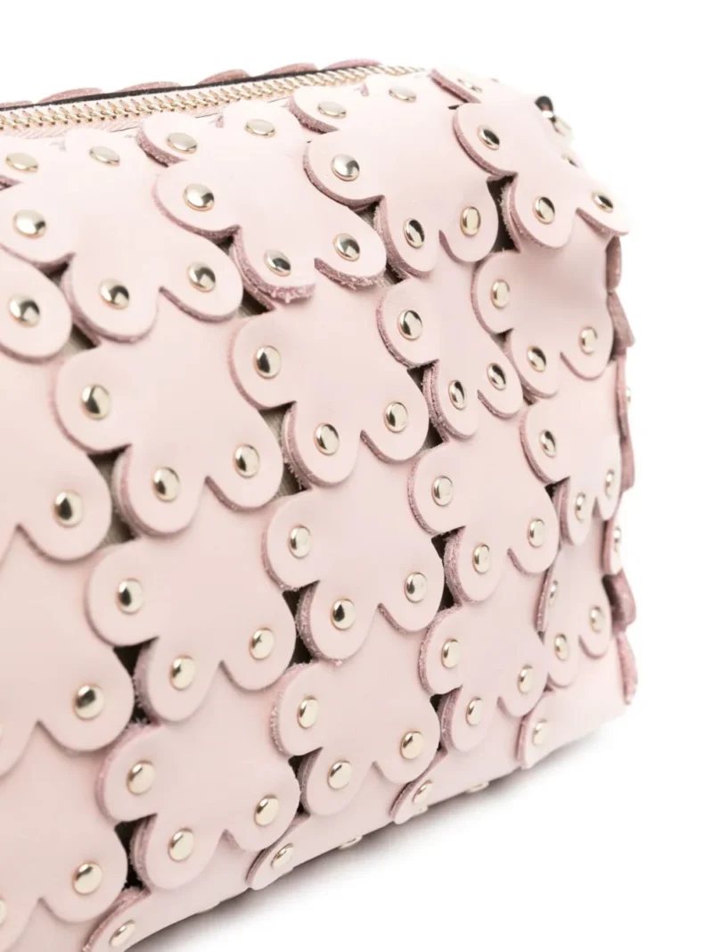 Geanta roz din piele naturala, cu inchidere fermoar, compartiment pricncipal, design tip puzzle cu insertii metalice si curea de umar detasabila. Detalii: Inaltime- 13 cm; latime- 22 cm; adancime- 7 cm. 100% piele naturala.