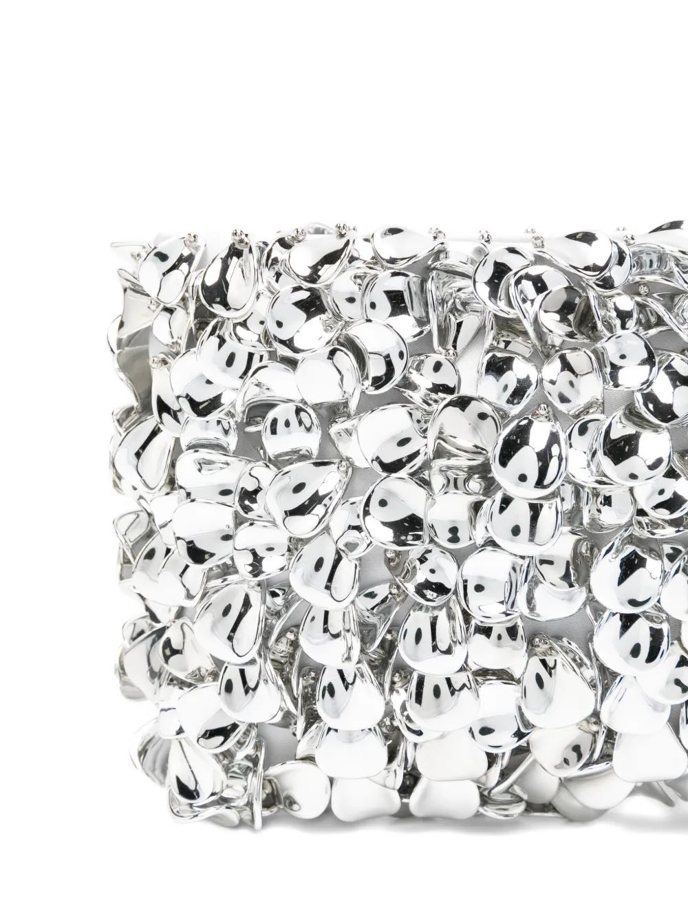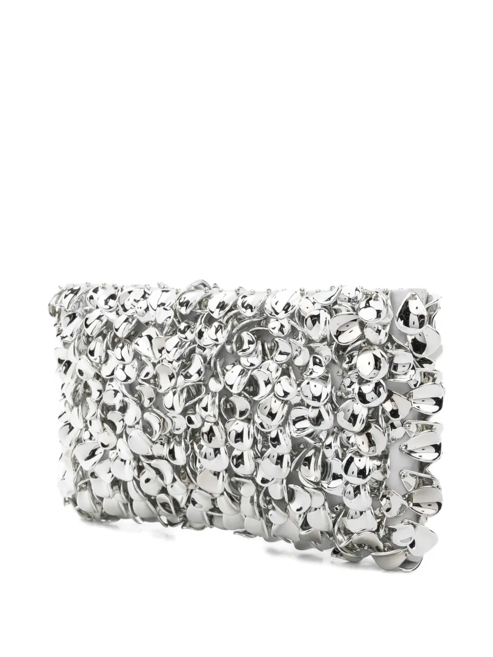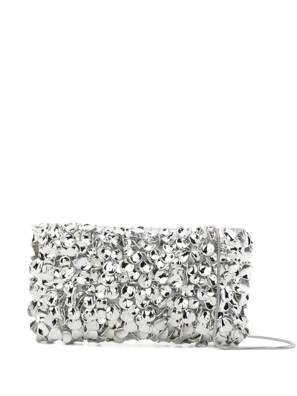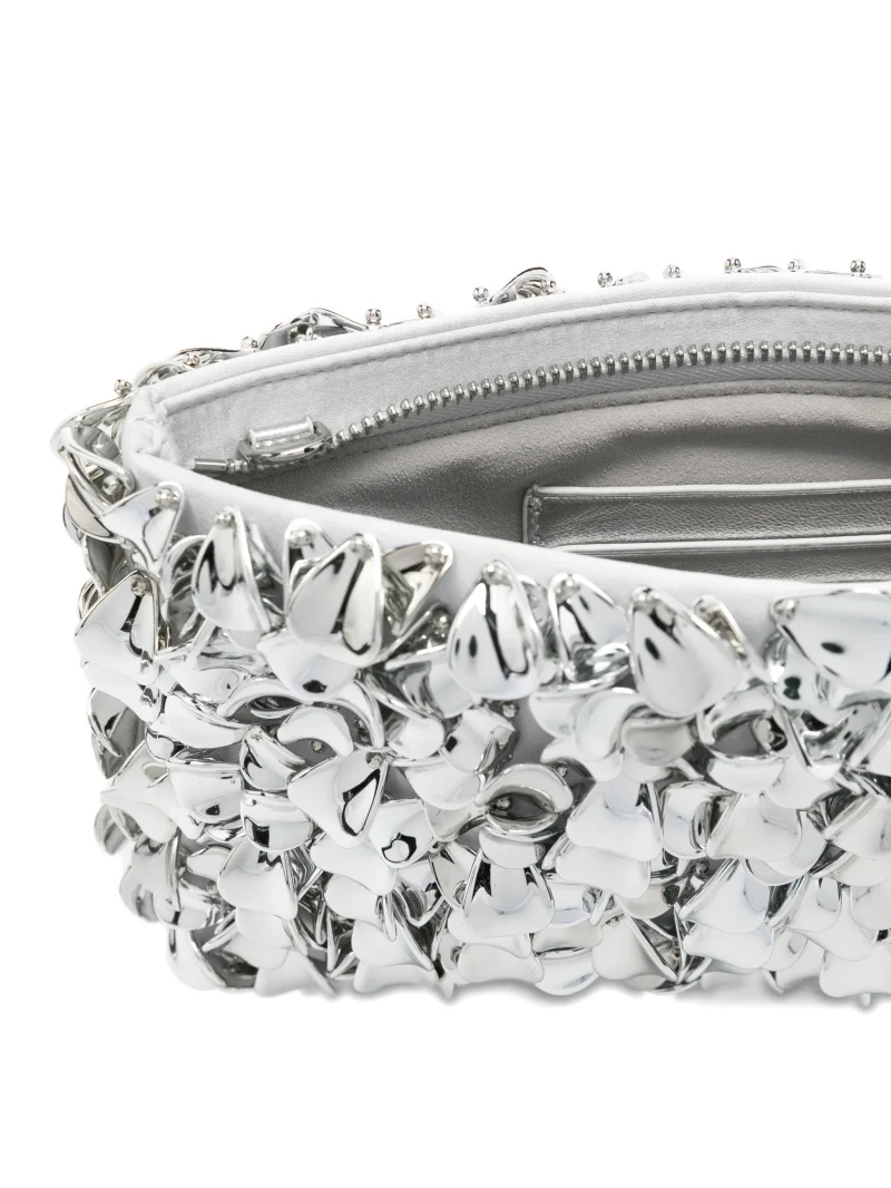 Geanta Simkhai Reese Beaded Chain-Strap Clutch argintiu, realizata din plastic, cu bareta Chain-Link pentru umeri, decorata integral cu elemente florale, inchidere cu fermoar, compartiment principal si sloturi pentru carduri la interior. Detalii: Inaltime- 14 cm; Adancime- 3 cm; Latime- 25 cm. 100% ABS (Acrylonitrile Butadiene Styrene)l; 100% poliester.