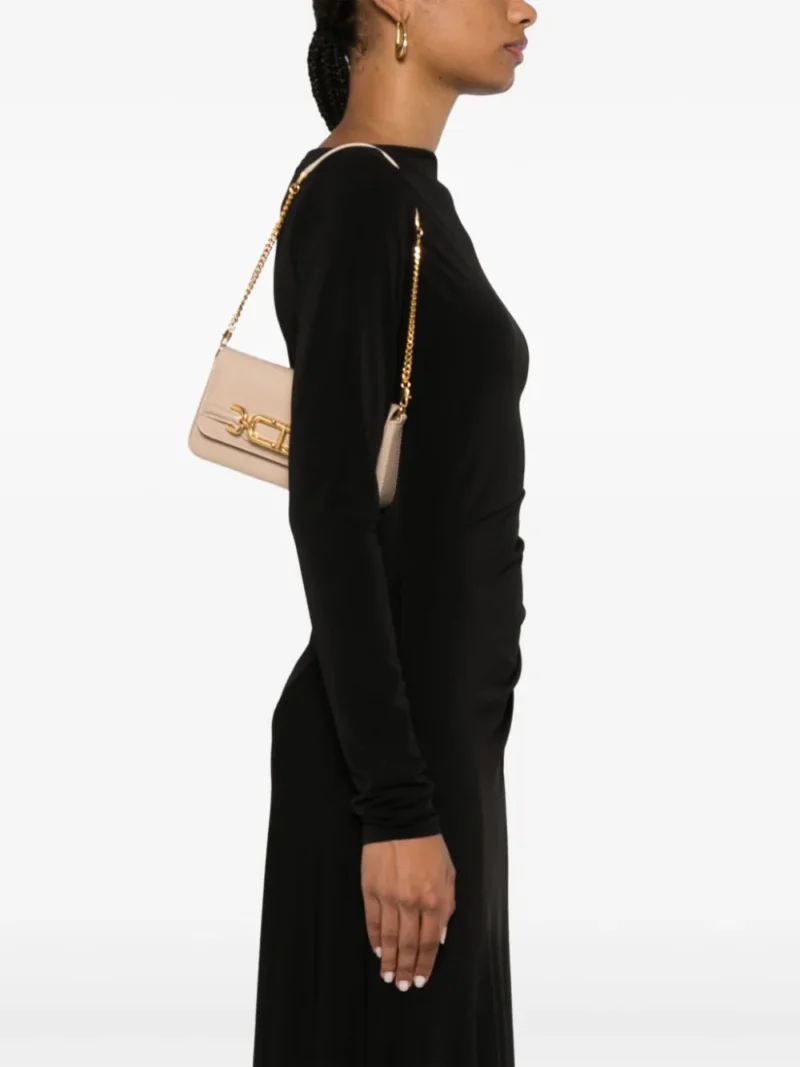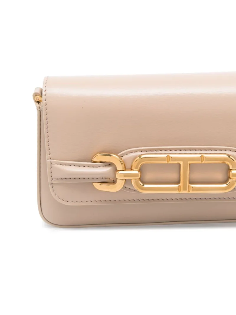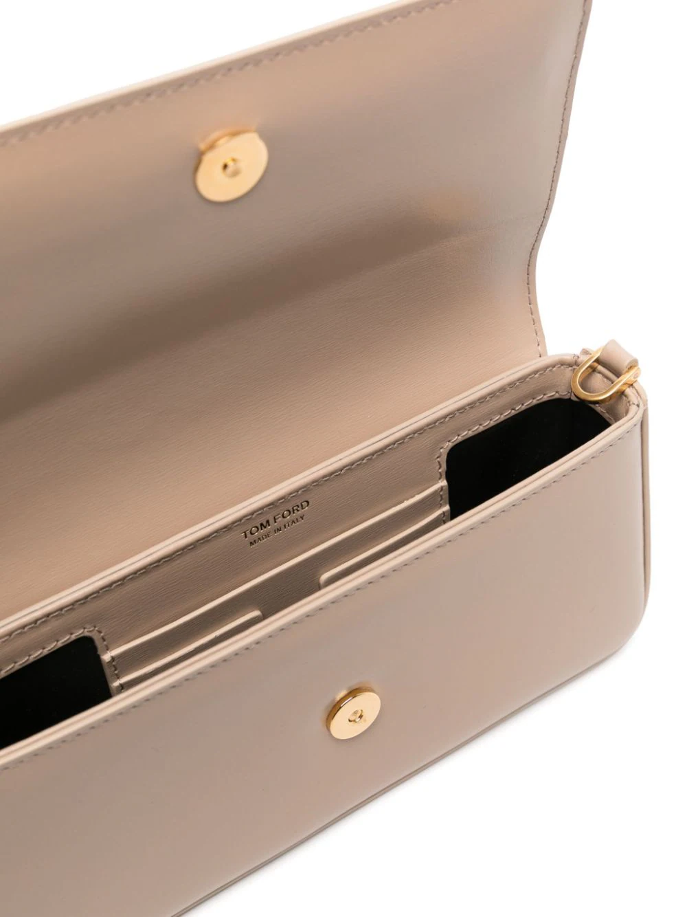 Geanta Tom Ford mini Clutch bej, cu inchidere clapeta si magnet, compartiment principal, slot interior pt carduri, curea decorativa cu logo metalic auriu si bareta de umar formata din curea si zale. Detalii: Latime- 20 cm; Adancime- 4cm; Inaltime- 10,5cm; Bareta- 49cm. 100% boss taurus; 100% alama; 100% piele de miel.