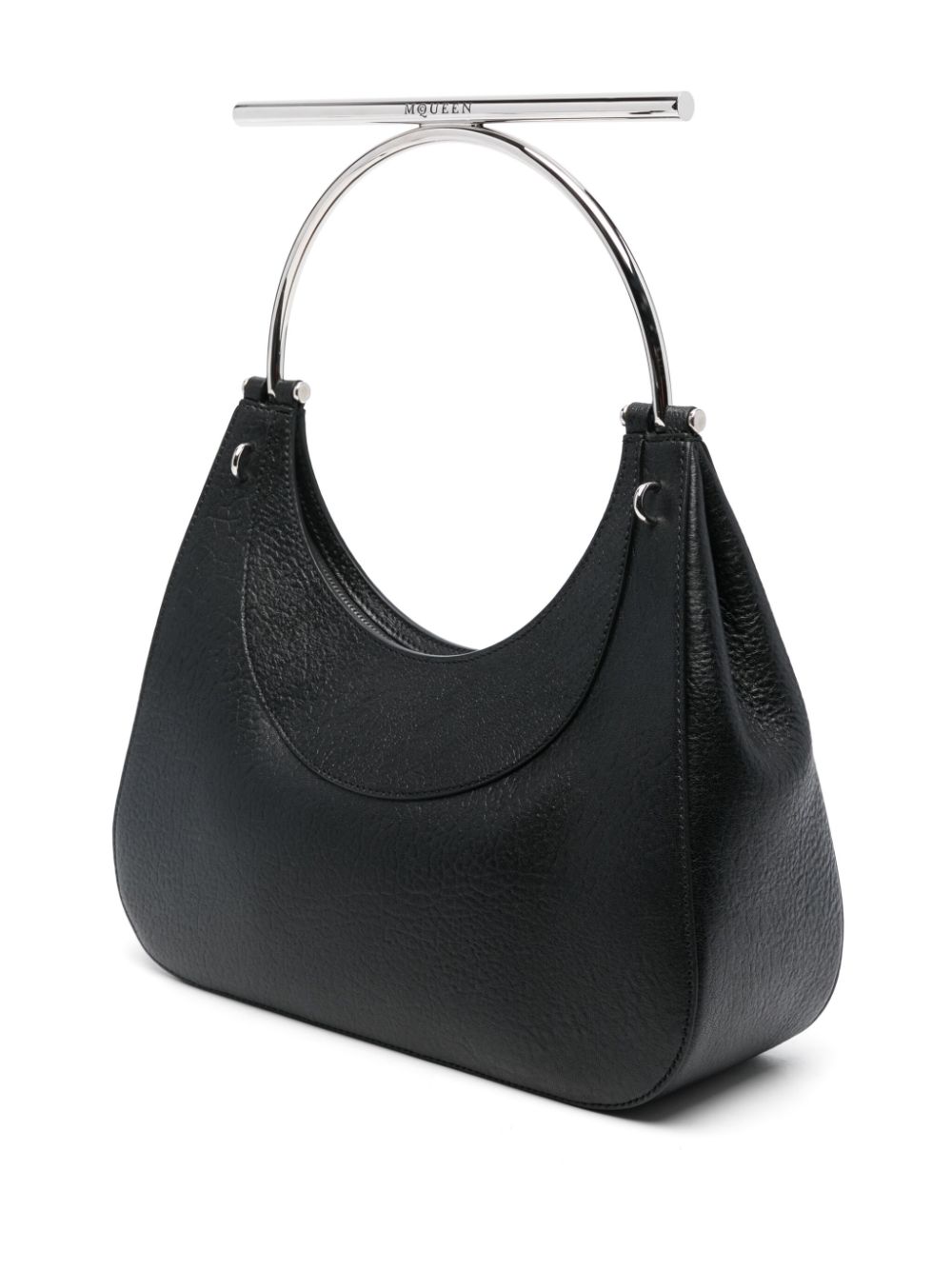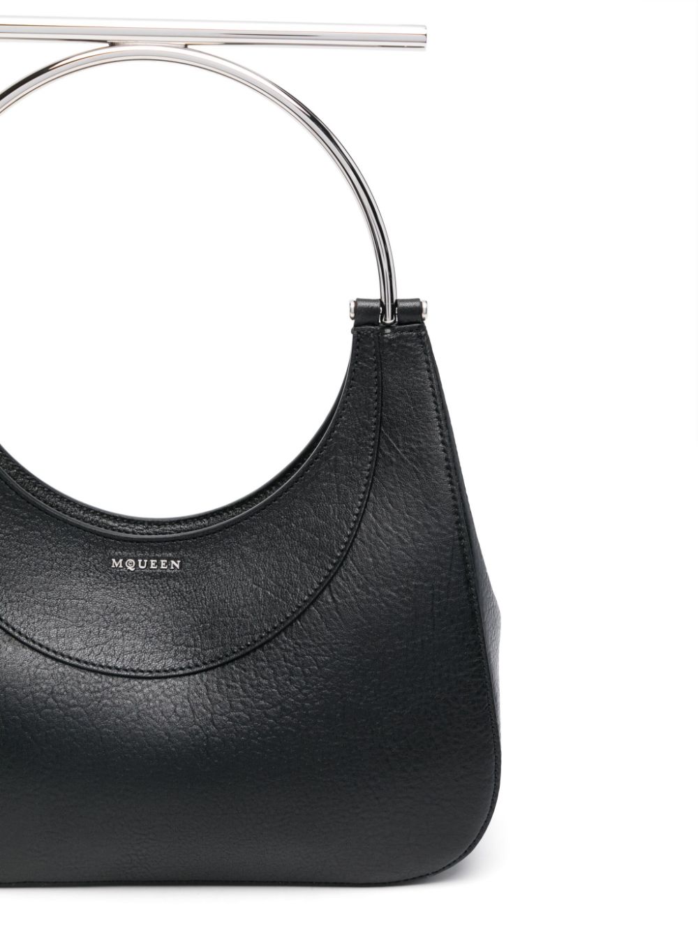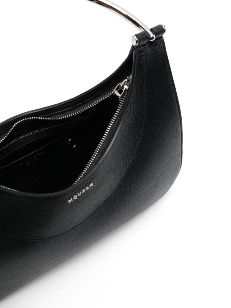 Geanta tote Alexander McQueen Cross-Bar negru, din piele texturata, cu inchidere fermoar, maner circular metalic, compartiment principal, sloturi pentru carduri, buzunar interior, logo McQueen aplicat pe partea din fata, captuseala din piele si curea de umar din zale. Detalii: Inaltime- 12 cm; latime- 29 cm; adancime- 10 cm; bareta- 130 cm. 100% piele de vitel; 100% metal.
