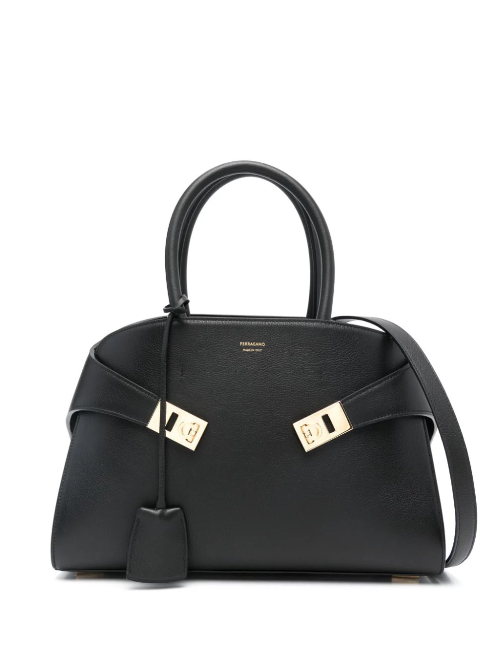 Geanta tote Ferragamo Medium Hug Gancini-Buckle negru, din piele de vitel cu efect granulat, maner dublu circular, fara inchidere, logo FERRAGAMO gravat pe partea din fata, charm din piele atasat, catarame toggle decorative, captuseala din piele, curea de umar detasabila si buzunar interior cu fermoar. 100% piele de vitel.