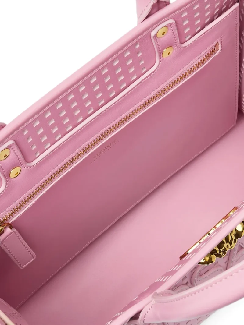 Geanta tote Versace small La Medusa Laser-Cut roz, din piele, cu forma patrata, manere circulare, logo metalic Medusa aplicat, compartiment principal, buzunar interior cu fermoar si bareta de umar ajustabila. 100% piele de vitel; 100% bumbac.